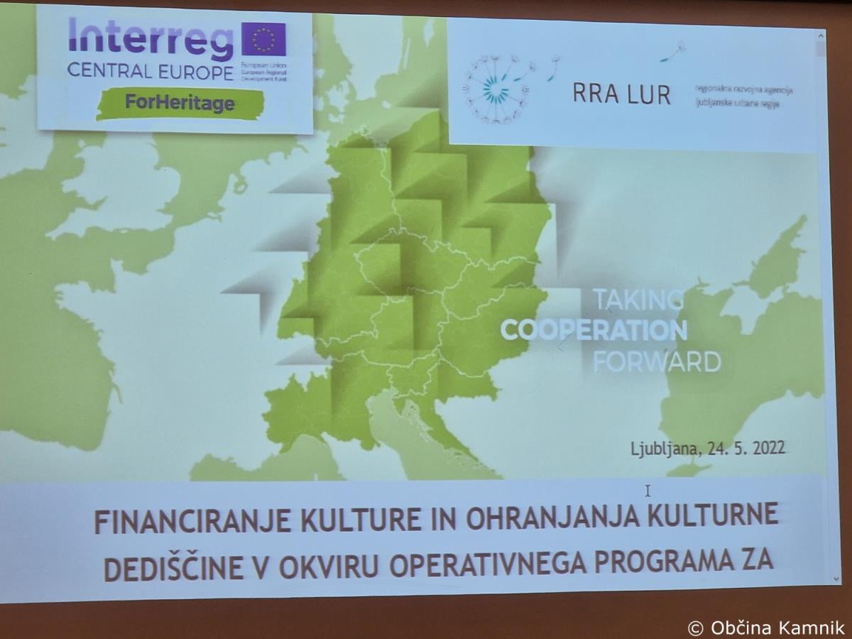 Regionalna razvojna agencija Ljubljanske urbane regije (RRA LUR) in Inštitut za ekonomska raziskovanja (IER) sta partnerja v projektu ForHeritage, kjer se partnerji osredotočamo na boljše upravljanje in financiranje kulturne dediščine. Dne 24.5.2022 se je v Mestni hiši v Ljubljani odvijalo nacionalno usposabljanje za boljše financiranje in upravljanje kulturne dediščine. Občina Kamnik je aktivna članica RRA LUR; članica delovne skupine pri pripravi »Strategije razvoja kulture v LUR« s strani Občine Kamnik je Liljana J.uhart Mastikosa. Delovno srečanje se je osredotočalo na financiranje kulture in kulturne dediščine v okviru dokumentov, ki bosta podlaga za črpanje evropskih sredstev za prihajajoče obdobje, in sicer Operativni program za obdobje 2021-2027 in Regionalni razvojni program Osrednjeslovenske regije 2021-2027.