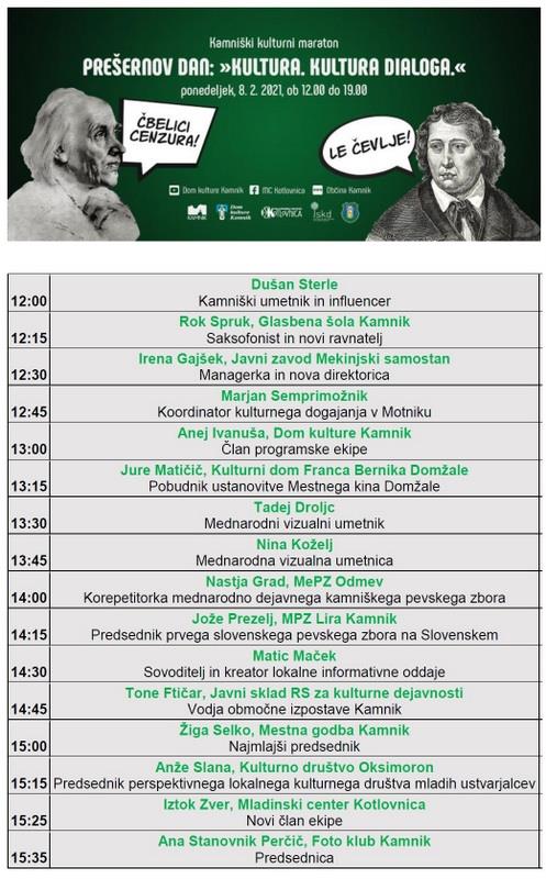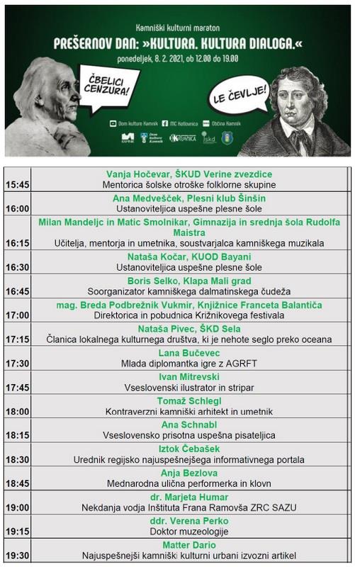 Občina Kamnik, Zavod za turizem, šport in kulturo in Dom kulture Kamnik so v sodelovanju s kamniško izpostavo Javnega sklada Republike Slovenije za kulturne dejavnosti, nevladnimi organizacijami, ki delujejo na področju kulture, in Mladinskim centrom Kotlovnica letos pripravili kar dvodnevno praznovanje Prešernovega dne in kamniške kulture. Poudarjali bomo kulturo dialoga, kulturo bivanja, se ozirali nazaj na delo kulturnih ustvarjalcev, nevladnih organizacij in javnih zavodov ter gledali naprej v razvoj kulture na Kamniškem.