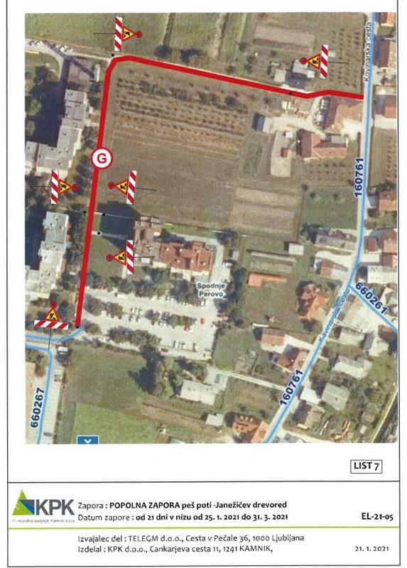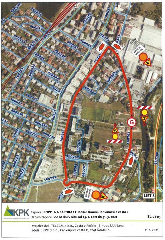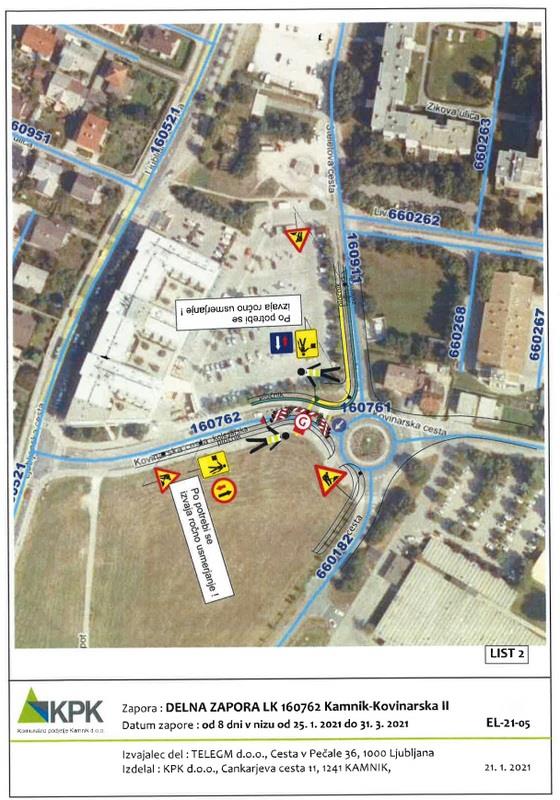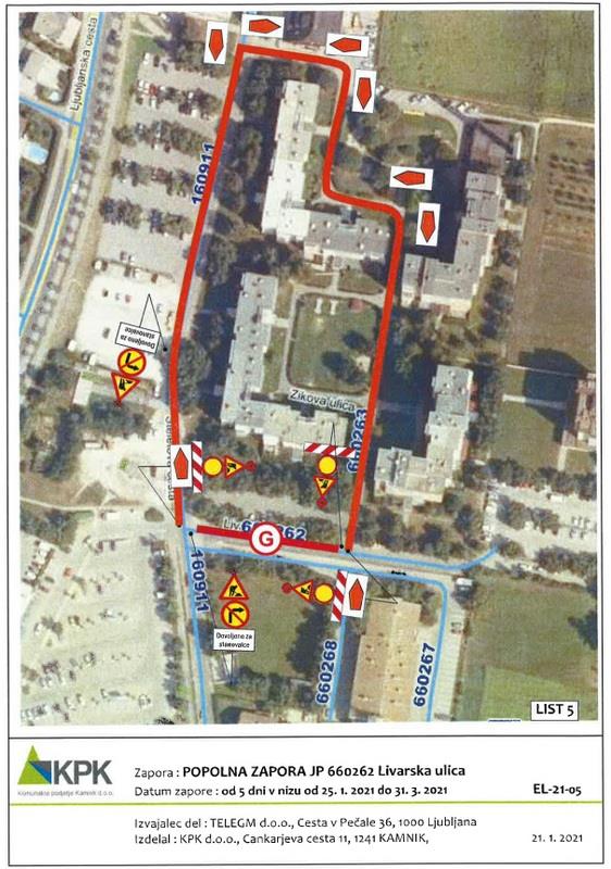 Popolna zapora javne poti – Livarska ulica se bo izvajala v dveh fazah. V času I. faze bo popolna zapora od Kovinarske ceste do križišča z Zikovo ulico. V tem času bo urejen obvoz po javni poti Zikova ulica. V II. fazi bo veljala popolna zapora od križišča z Zikovo ulico do parkirišča na Livarski cesti. V tem času ni možnega obvoza, zato mora izvajalec del vsaj 3 dni pred zaporo vse stanovalce na naslovu Livarska ulica 5 in 7 pisno obvestiti o lokaciji, trajanju in načinu zapore ter jim občasno omogočiti dostop do stanovanjskih objektov. V času popolne zapore lokalne ceste Kamnik – Kovinarska I bo do stanovanjskih in poslovnih objektov urejen obvoz po Steletovi in Kovinarski cesti. V času popolne zapore pešpoti – Janežičev drevored imajo stanovalci možnost uporabljati druge peš površine na tem območju.