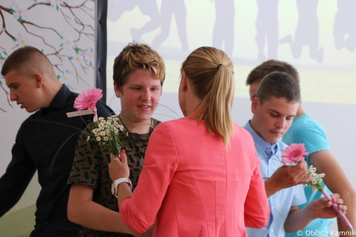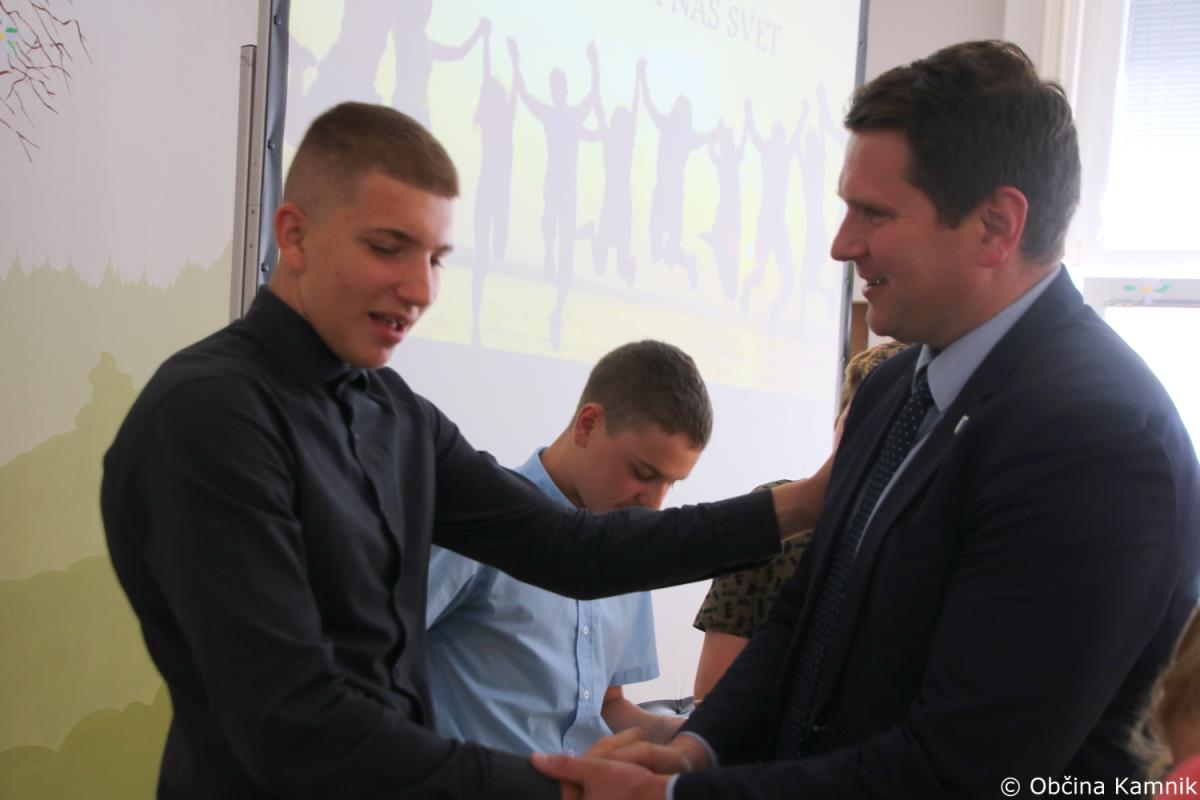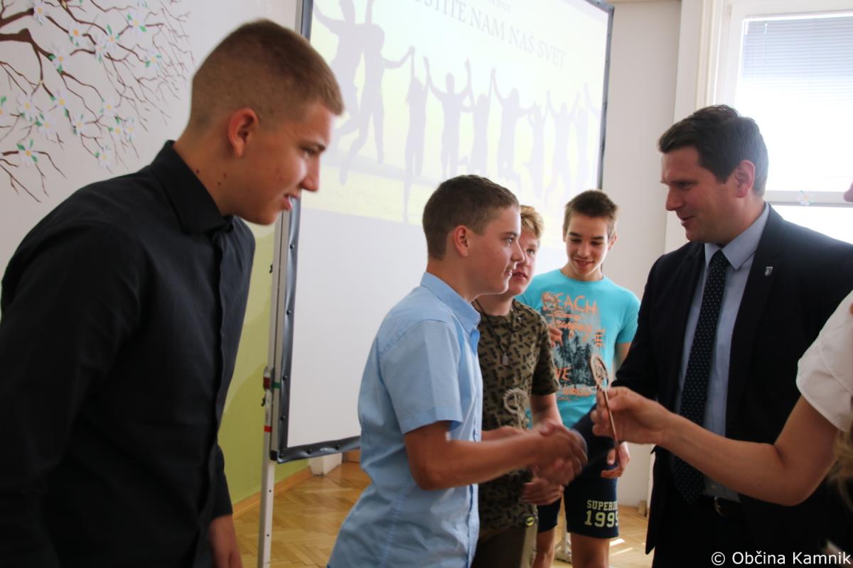 Župan Matej Slapar pa je ob tej priložnosti devetošolcem namenil naslednjo popotnico: »Na Osnovni šoli 27. julij Kamnik ne bo več isto, saj ne bo več vas, dragi devetošolci, štirih izjemnih fantov, ki odhaja v svet. Odhajate v nadaljnje šolanje in prepričan sem, da ste z znanjem, ki ste ga prejeli v osnovni šoli in je na visokem nivoju, dobro opremljeni za nadaljnje življenje. Kot je bilo že danes povedano, če boste nadaljevali tako, d ste pridni, delavni, pošteni in zavzeti, boste uspelo tam, kjer ste si zadali. Da boste torej uspešni peki, mizarji, avtomehanik in gradbeni šef. Sledite svojim sanjam in uspelo vam bo. Ohranite vrednote poštenja, delavnosti in zavzetosti ter izpolnjujte tisto, kar vam bo zadano. Na Osnovni šoli 27. julij Kamnik se celoten strokovni kader resnično izjemno trudi in te osnove, ki ste jih dobili so hvale vredne. Zato je tudi prav, da ste se malo prej zahvalili vsem učiteljem in ostalim zaposlenim na šoli, ki so vam na tej poti pomagali. Borite se naprej, ko pa bo težko, ko boste na križpotju, pa se lahko obrnete in zanesite na starše, prijatelje in učitelje. Srečno naprej in čestitke za vaš uspeh na Osnovni šoli 27. julij Kamnik.«