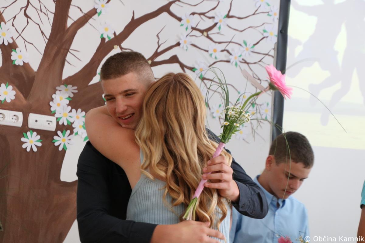 Takole se je od svojih učencev Nika Berganta, Kristjana Rosa, Nejca Šuštarja in Ernada Lakića poslovila njihova razredničarka: »Dragi fantje, z današnjim dnem je vaše osnovnošolsko izobraževanje končano. Iskrene čestitke! Naše sodelovanje je bilo relativno kratko, a ob vas sem se tudi sama naučila ogromno. Zlagala bi se, če bi dejala, da mi niste nikdar povzročali preglavic in mi ob tem normalizirali moj prenizek pritisk. Zagotovo pa se vas ne bom spominjala po slabih stvareh, temveč vas bom ohranila v spominu po vaših dobrih lastnostih in po dogodkih, v katerih smo skupaj uživali. Niko, si izjemen fant, prijazen, dobrovoljen, vedno si pripravljen vsakomur in vsakokrat priskočiti na pomoč. Si izredno vedoželjen fant, ohrani to! Vem, da boš svoje delo opravljal več kot nadpovprečno in boš v veselje vsakemu šefu. Le en mali nasvet. Ne pusti, da bi drugi izkoriščali tvojo prijaznost in delavnost. Kristjan, tvoje srce je na pravem mestu. Verjamem, da se bo ob koncu pubertete tudi glava usidrala na pravo mesto. Vedno sem občudovala tvojo neverjetno spretnost ob spajanju vseh žičk, ko je kar naenkrat vse gorelo in se vrtelo. Tvoje otroške sanje – postati avtomehanik – niso nedosegljive. Z veliko truda, predvsem pa močne volje ti bo zagotovo uspelo. Nejc, si izredno dober prijatelj in marljiv učenec. Zdi se mi, da si bil vedno dobre volje in nasmejan. Všeč pa mi je bilo, da si v letošnjem šolskem letu pokazal in povedal tudi, ko ti kaj ni bilo po volji. Prav je, da se postaviš zase. Tudi tebi želim obilo uspeha pri nadaljnjem šolanju. Ernad, v letošnjem šolskem letu si bil naše največje presenečenje. Pokazal si svoje izjemno znanje, sodelovanje in nemalokrat si bil pripravljen pomagati svojim sošolcem. Nam zaposlenim pa si dal pomembno lekcijo – mi odrasli ne bi smeli nikoli, ampak res nikoli, obupati nad nobenim otrokom. Kot si dejal v svojem življenjepisu, si želiš dobrih delavcev. Privoščim ti jih. Želim pa si, da boš ti njihov najboljši šef. Vsem štirim pa za konec še eno misel, nasvet, ki sem ga že tolikokrat povedala v razredu. Ko boste izbirali med prav in prijazno, vedno izberite prijazno. Naj vam uspe na vaši novi poti.«