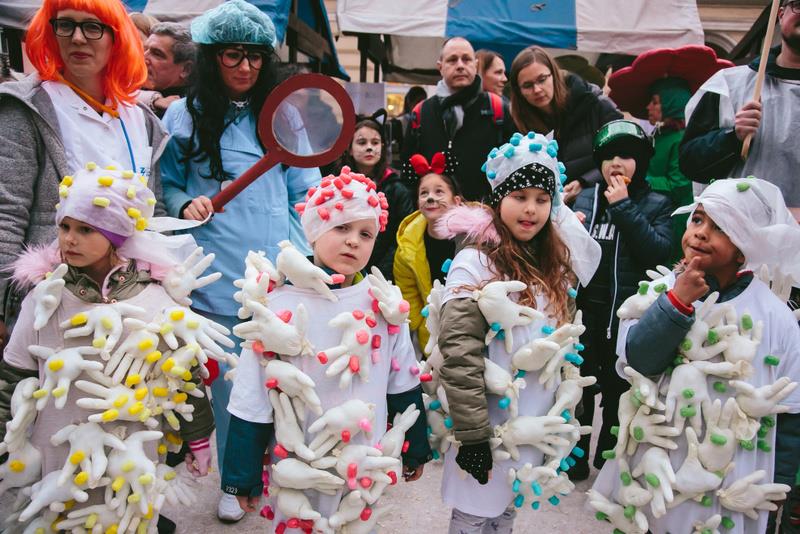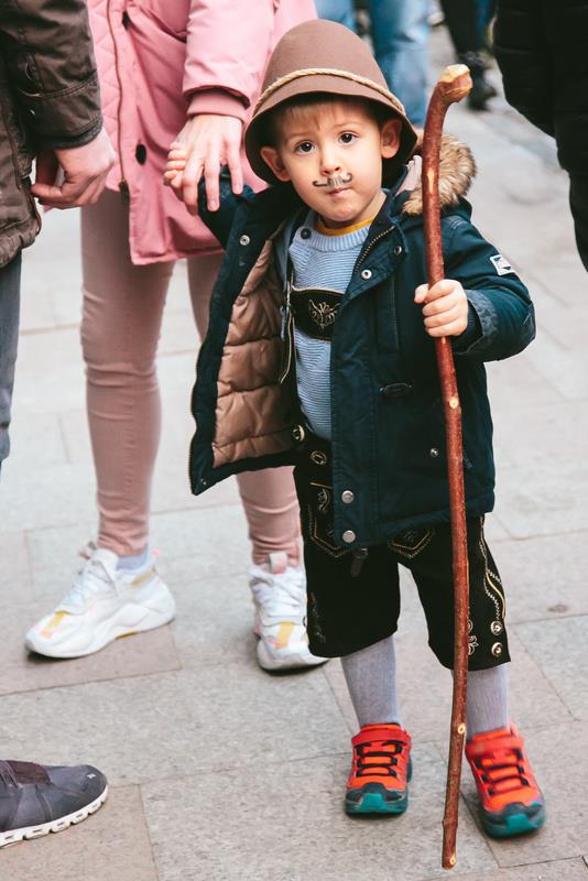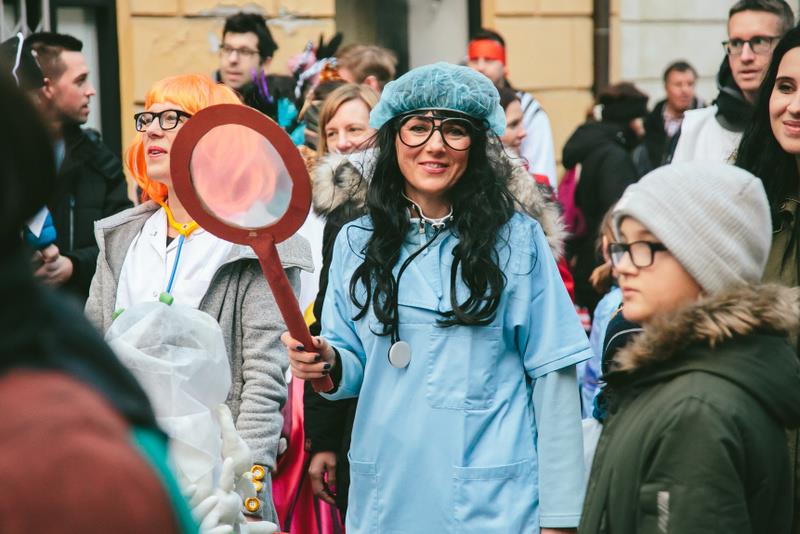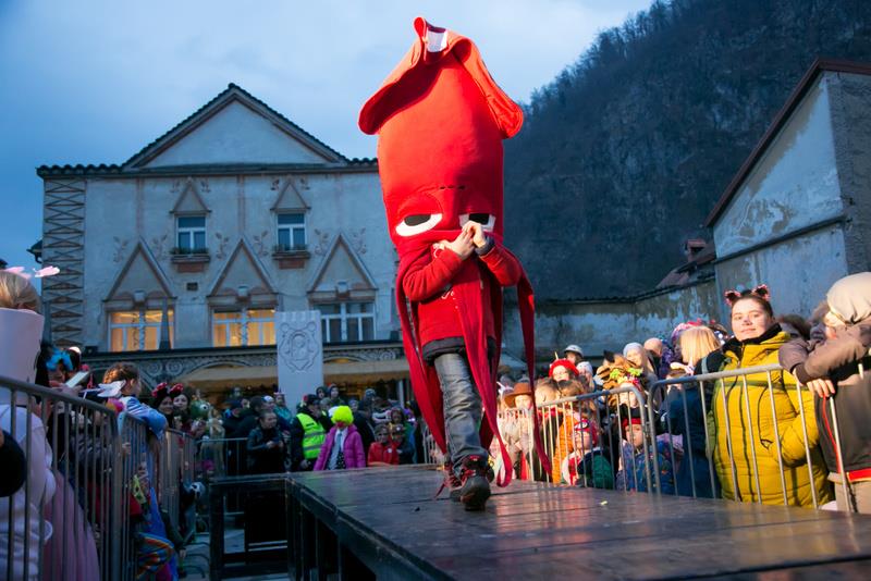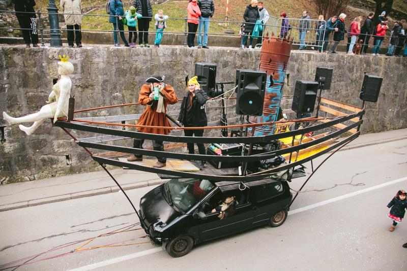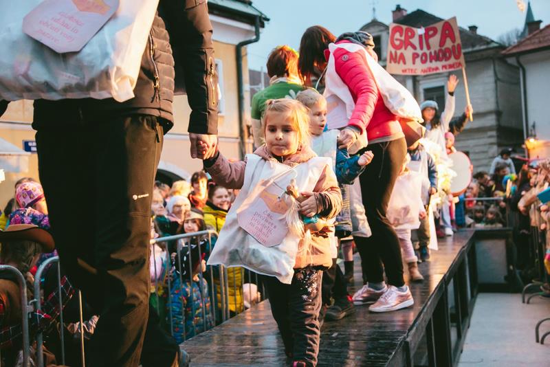 Pisana povorka pustnih šem vseh oblik in velikosti se je vila čez Šutno proti Glavnemu trgu, kjer so maškare pričakali krofi ter posebna ocenjevalna komisija, ki je iskala najlepše in najbolj izvirne maškare.