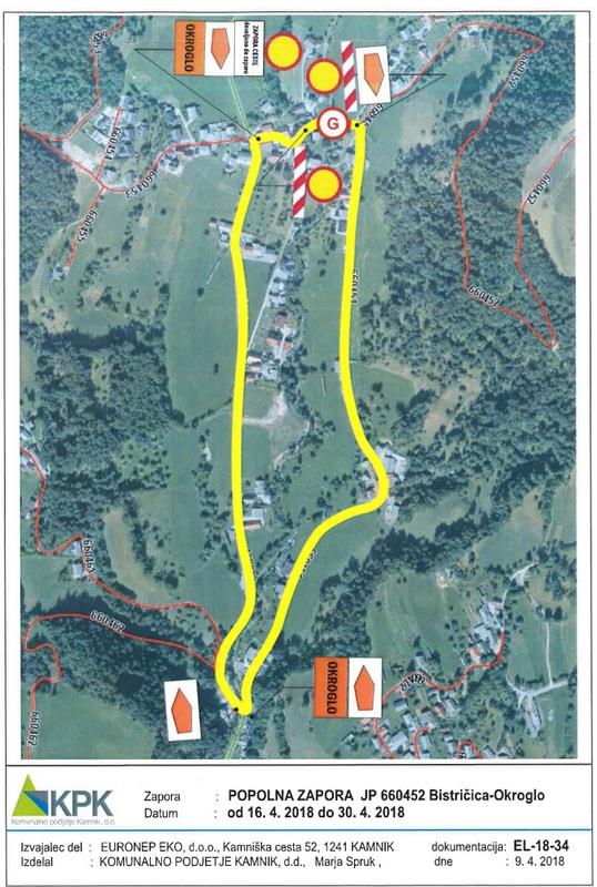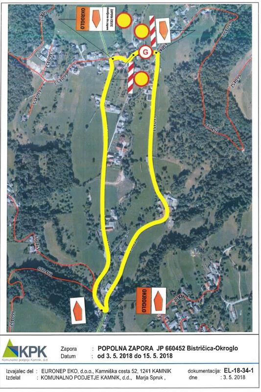 Občina Kamnik občanke in občane obvešča, da se popolna zapora javne poti Bistričica – Okroglo podaljša do 15. 5. 2018. Vsa ostala določila, navedena spodaj, ostajajo nespremenjena in so v veljavi.