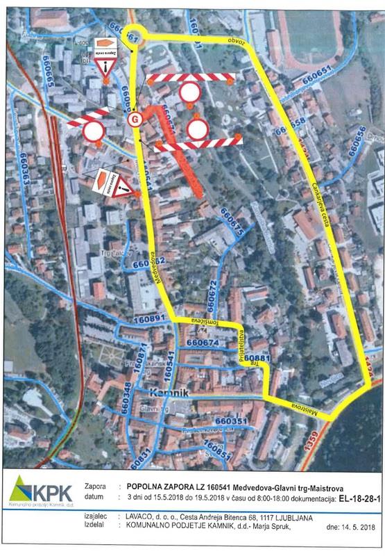 Investitor Občina Kamnik in izvajalec del Lavaco d. o. o. občanke in občane Občine Kamnik seznanjata s spremembo prometnega režima - popolno zaporo ter prekopom Medvedove ulice zaradi prevezave novega vodovoda na obstoječi vodovod. Sprememba prometnega režima oziroma popolna zapora in prekop Medvedove – Glavnega trga – Maistrove (pri hišni številki Medvedova 40) se bo izvajala 3 dni v času od torka, 15. maja 2018, do sobote,19. maja 2018. Dela se bodo izvajala med 8. in 18. uro, izvajalec del pa mora cestišče za prevoznost izven delovnega časa urediti v normalno prevozno stanje.