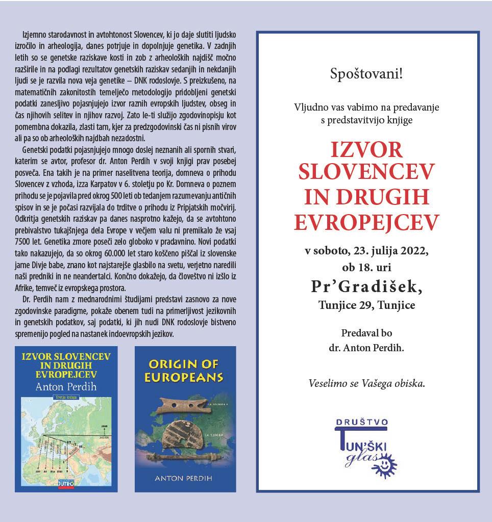 Dr. Anton Perdih nam bo z mednarodnimi študijami predstavil zasnovo za nove zgodovinske paradigme, obenem nam bo pokazal tudi na primerljivosti jezikovnih in genetskih podatkov. Podatki, ki jih nudi DNK, bistveno spremenijo pogled na nastanek indoevropskih jezikov. Genetski podatki pojasnjujejo mnogo doslej neznanih ali spornih stvari, katerim se avtor, profesor dr. Anton Perdih v svoji knjigi prav posebej posveča. Ena takih je na primer naselitvena teorija, domneva o prihodu Slovencev z vzhoda, izza Karpatov v 6. stoletju po Kr.