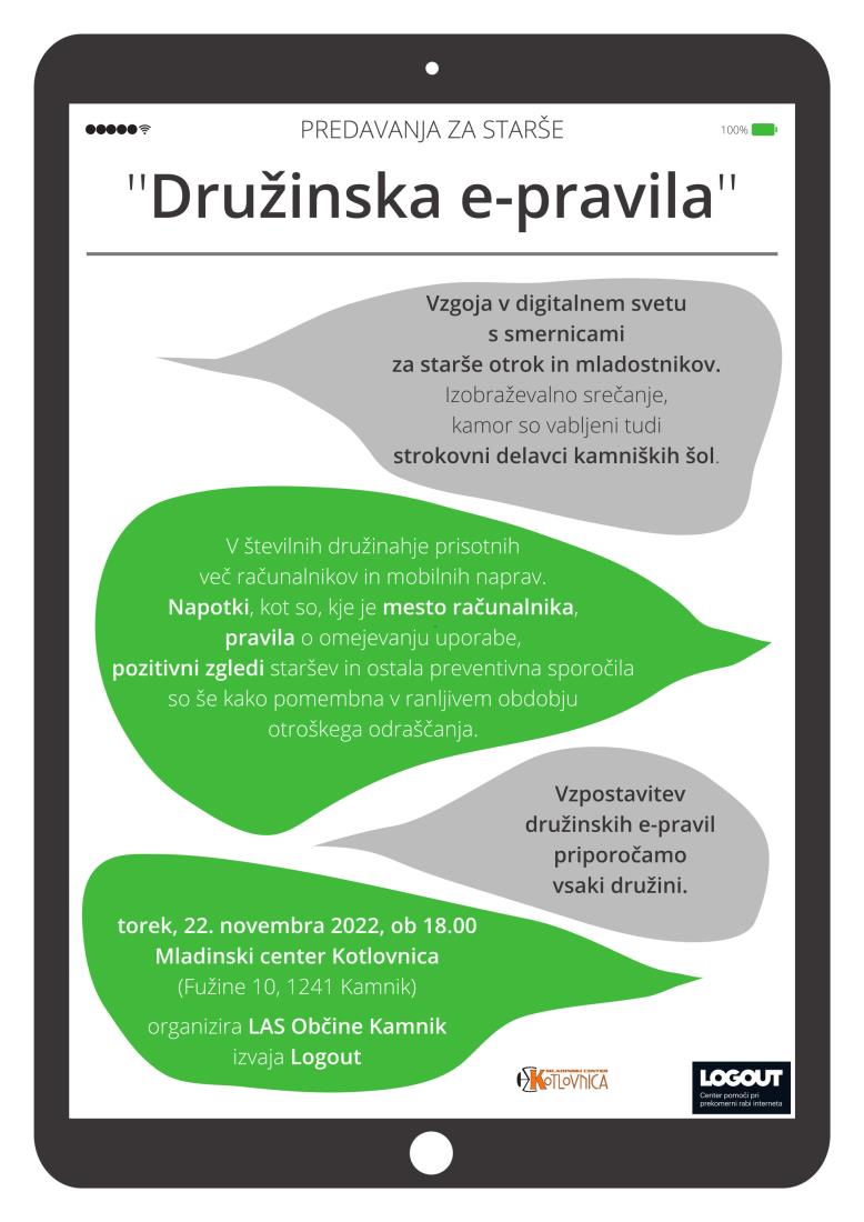Lokalna akcijska skupina (LAS) vabi na drugo predavanje za starše: Družinska e-pravila, ki bo v torek, 22. novembra 2022, se bo v MC Kotlovnica, ob 18. uri odvilo drugo predavanje za starše Družinska e-pravila v izvedbi Logout-a.