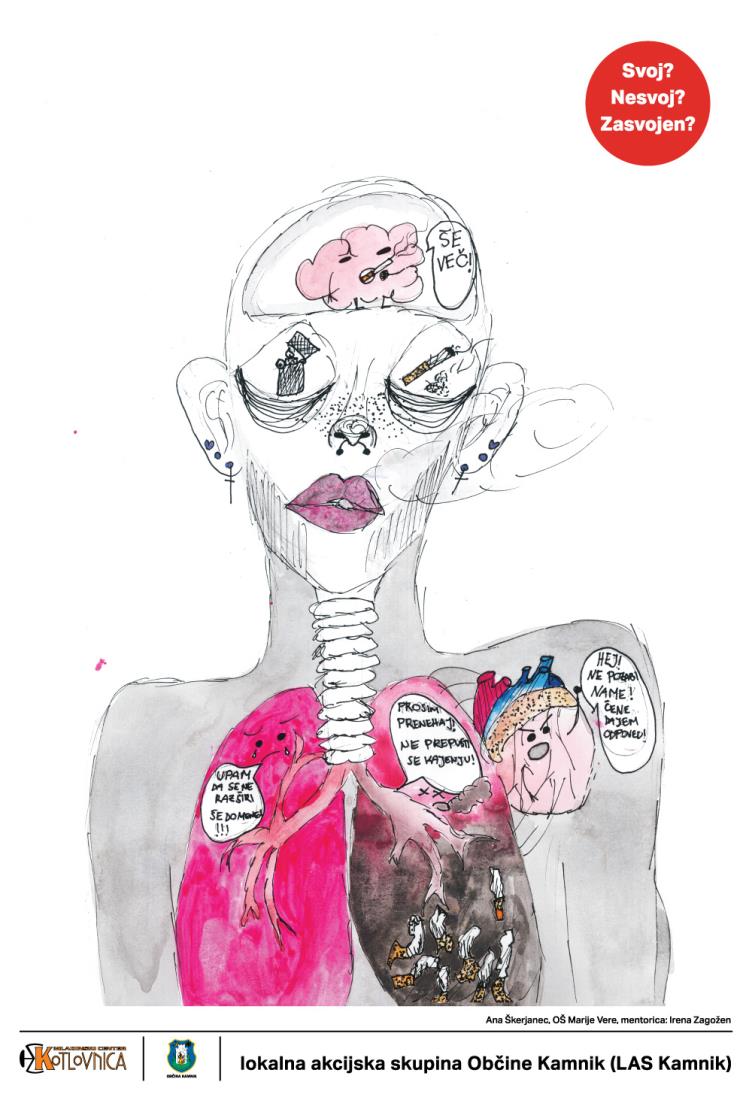 Škerjanec Ana (OŠ Marije Vere, mentorica: Irena Zagožen) je narisala nekakšno znanstveno shemo kadilke. Kadilčini možgani so popolnoma obsedeni s smrtonosno zasvojenostjo s tobakom, medtem ko vsi ostali deli njenega telesa na ves glas kričijo in kadilko prosijo, da naj čim prej preneha s kajenjem. Seveda, saj ta smrtonosna odvisnost seje smrt povsod, kjer lahko.