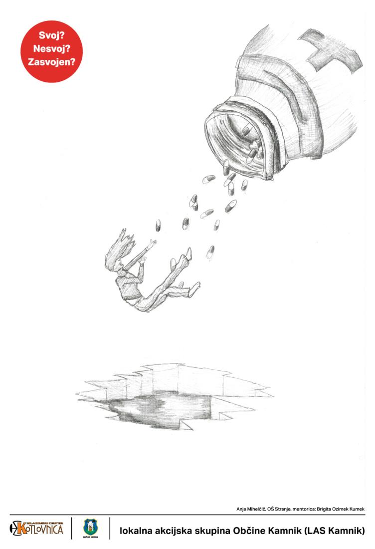 Anja Mihelčič (OŠ Stranje, mentorica: Brigita Ozimek Kumek) je naredila izjemno enostavno, a zato tudi precej učinkovito risbo. Odvisnica pada v brezdanje brezno skupaj s tabletami, ki so jo zasvojile.