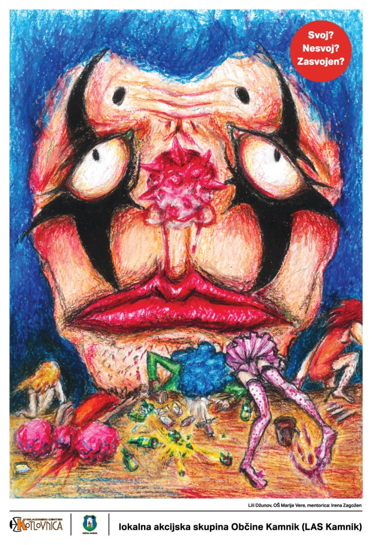Lili Džunov (OŠ Marije Vere, mentorica: Irena Zagožen) je komisiji znana že od lani, ko je bilo njeno delo prav tako izbrano na natečaju. Tudi tokrat je prispevala likovno zelo bogato delo, polno barv, tekstur in različnih podrobnosti, ki gledalca zlahka potegnejo vase. Na njem je upodobila obraz zasvojenca skupaj s steklenicami, brizgami in ostalimi razlogi za njegovo zasvojenost. Obraz pa je izjemno razbrazdan in uničen ter predvsem zelo žalosten.