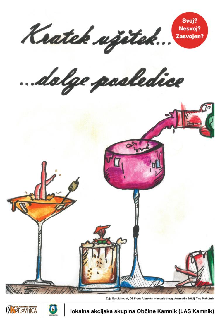 Zoja Spruk Novak (OŠ Frana Albrehta, mentorica: mag. Anamarija Erčulj in Tina Plahutnik) je poslala fino oblikovan plakat, ki nas opozarja na posledice pitja alkohola. Pijačo, steklenico in kozarce je narisala tako lepo in privlačno, da spominjajo na oglase za alkoholne pijače. A za razliko o privlačnih oglasov Zoja pokaže tudi temno plat pitja alkoholnih napitkov.