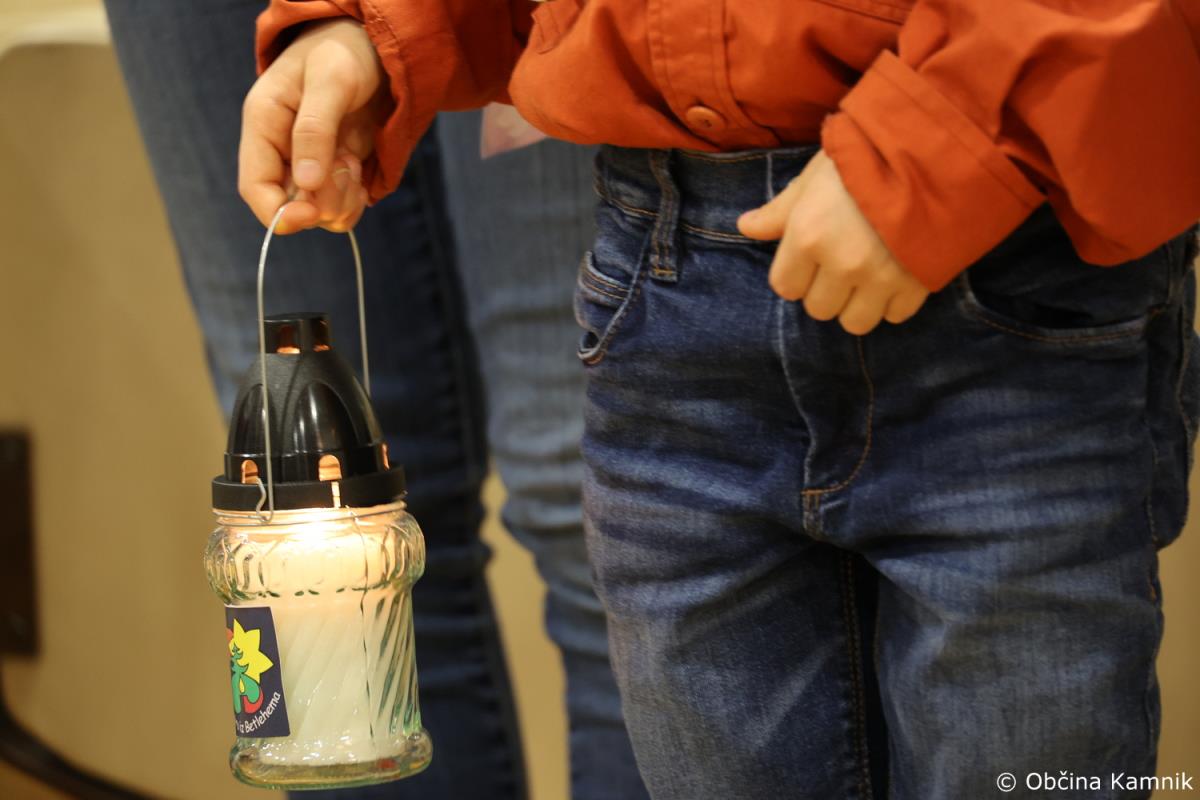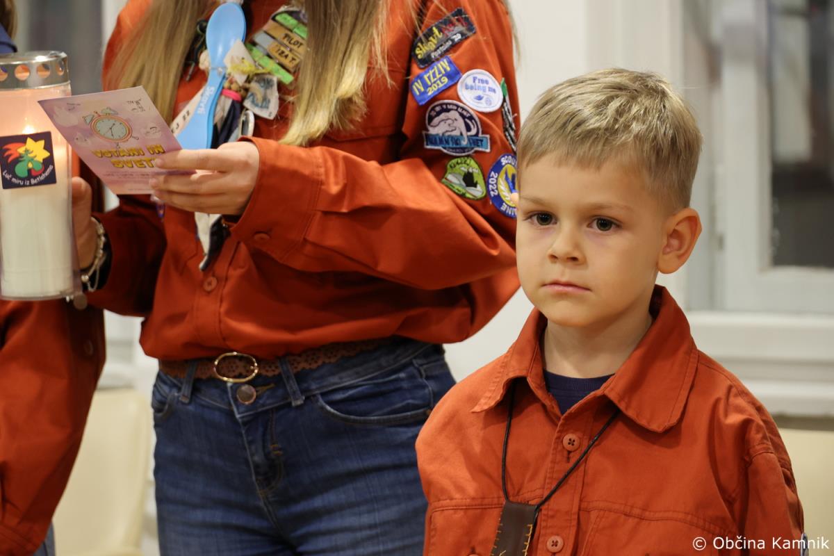 Letošnje geslo je »Vstani in sveti!«, kamniški skavti pa so nam prebrali in namenili poslanico, ki se glasi: »Kaj ti je, da spiš? Vojna, stiske, bolezni, nesreče, osamljenost…Kaj pa ti? Se bojiš? Živiš, kakor da se nič ni zgodilo? Seveda, težko nam je, ko vidimo, kaj vse se dogaja in se nam zdi, da ne moremo nič. Pa vendar je že iskra dovolj, da vname ogenj, in kaplja dovolj, da ga pogasi. Zbudi se! Božič je. Naj ti ne bo vseeno za temo v svetu. Ni ti treba spremeniti vsega, naredi eno dobro delo, pospravi sobo, skuhaj komu kavo, spusti avto predse. Ko boš premaknil sebe, boš obrnil svet. Zaneti iskro, naj v tebi zasije Luč. Vstani in sveti.«