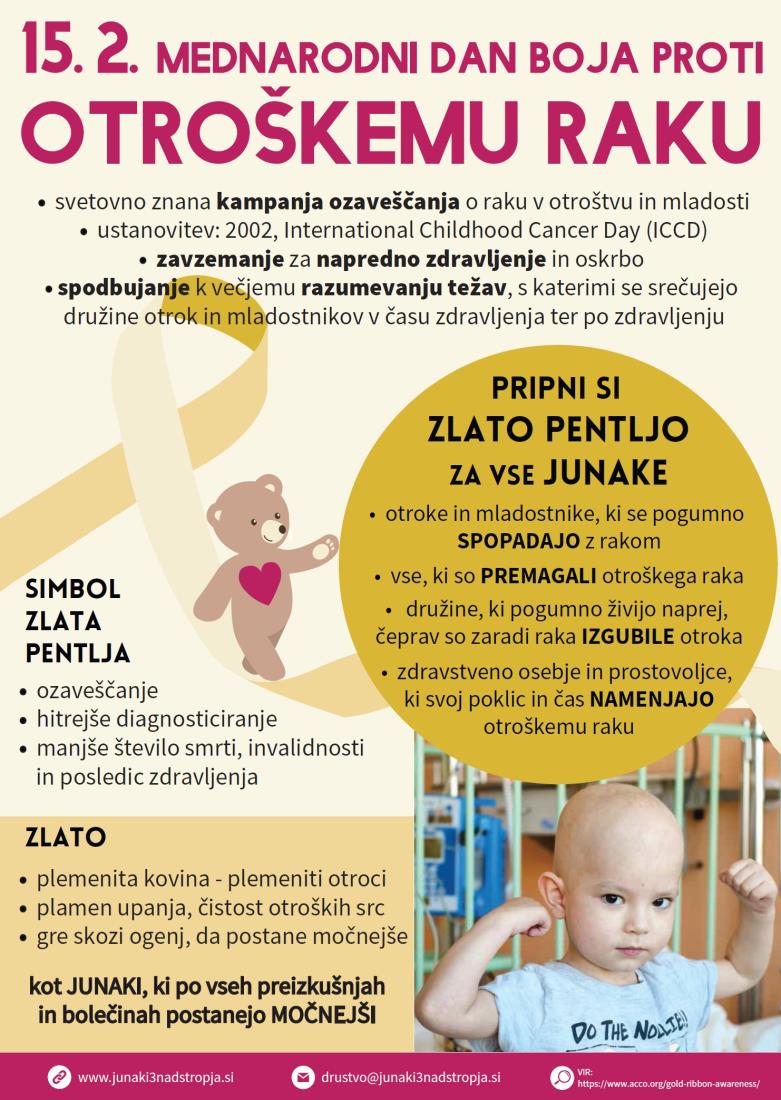 Društvo Junaki 3. nadstropja, ki so ga ustanovili starši otrok z rakom, za mednarodni dan boja proti otroškemu raku, ki ga obeležujemo vsako leto 15. 2., organizira vseslovensko akcijo ozaveščanja. K sodelovanju pri ozaveščanju so vabljene vse šole, vrtci, občine in prav vsak posameznik. Prav vsi pa si lahko pripnemo zlato pentljo in s tem pripomoremo k ozaveščenosti. Pomagajmo Junakom, da bodo njihovi dnevi vsaj nekoliko lažji in lepši!
