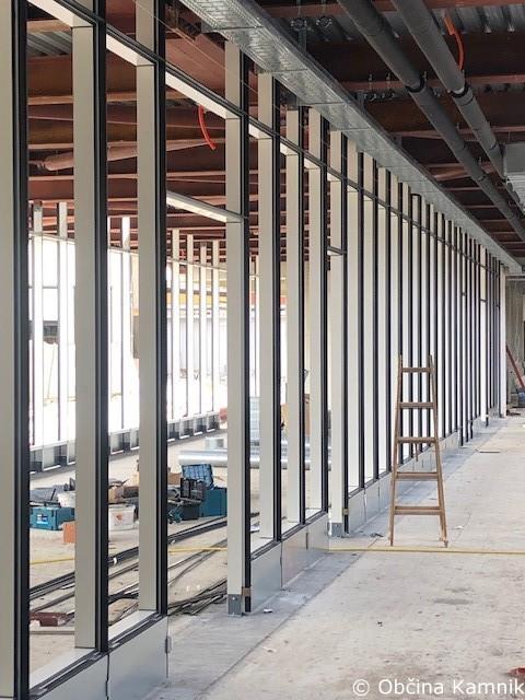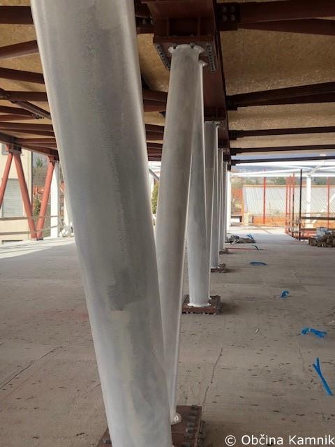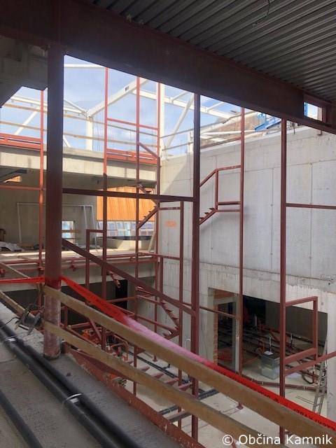 Na gradbišču nove osnovne šole so se v preteklem tednu izvajala predvsem obrtniška dela v notranjosti, precej aktivnosti pa je bilo povezanih tudi z izvedbo več zahtevnih kovinskih konstrukcij; nad lamelo B in C je postavljena streha, izvajalec kovinske konstrukcije je na delu že izvedel osnovni zaščitni premaz, izvedena je večja železna konstrukcija osrednjega stopnišča med lamelo A in B, zaključuje se tudi kovinski skelet zgornje etaže na lameli A.