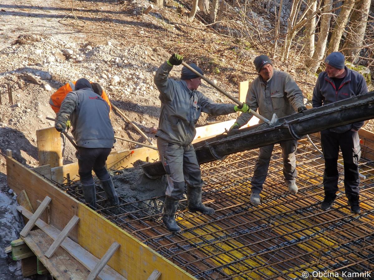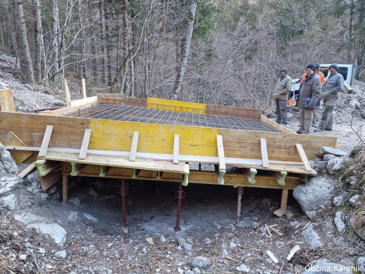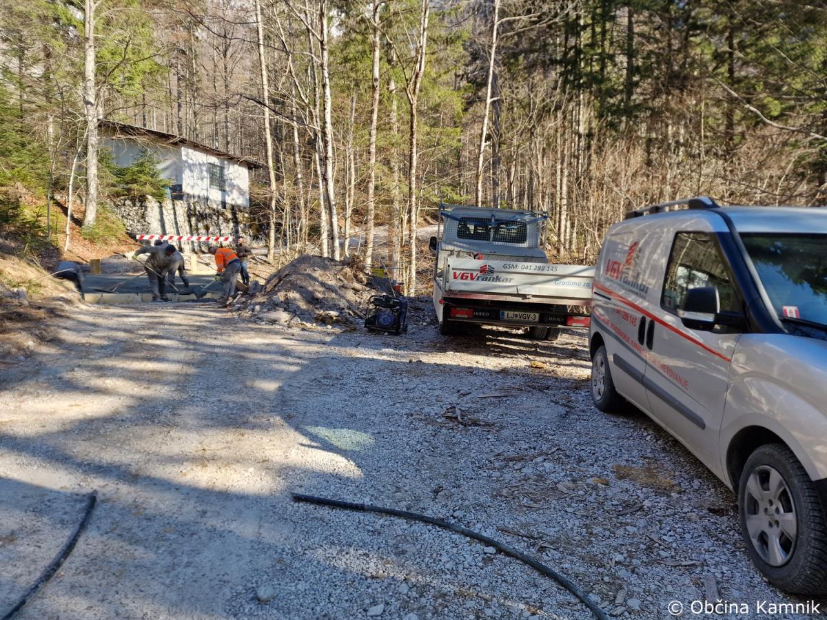 Začela so se gradbena dela na občinski cesti JP660727 Kamniška Bistrica, ki vodi do tovorne žičnice za Kokrsko sedlo. Gradnja zajema odstranitev vseh treh mostov, ureditev podpornikov mostu ter struge in postavitev treh novih mostov. V preteklem tednu je bilo izvedeno betoniranje prvega mostu. Nadzor nad gradnjo izvaja geomehanik in gradbeni nadzornik Martin Vrabec. Izvajalec del je podjetje VGVrankar, d. o. o. Vrednost sanacije vseh treh mostov je ocenjena na 33.714 evrov. Ocenjujemo, da bodo dela po terminskem planu zaključena do konca meseca maja 2023.