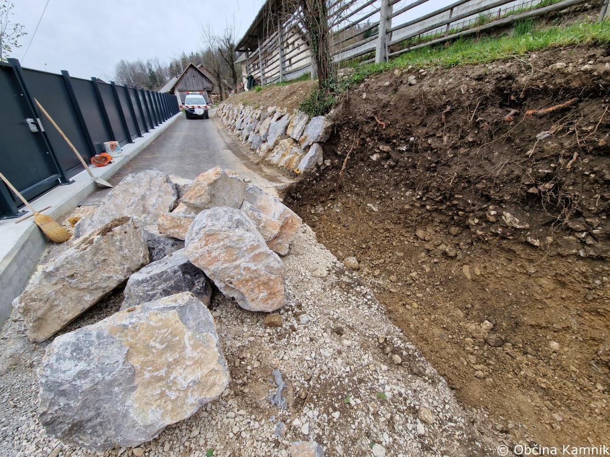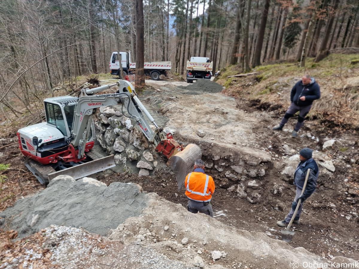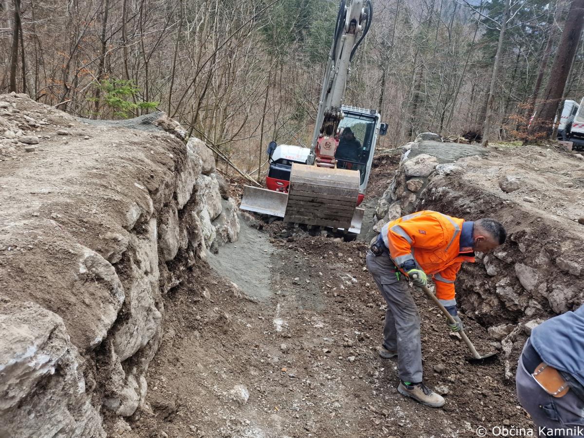 Sanacija zajema izgradnjo oporne konstrukcije, kamniti oporni zid iz kamna v betonu dolžine 15 metrov in višine 2,6 metra, ureditev odvodnjavanja, zavarovanje ukopne brežine nad cesto ter obnova cestišča. Trenutno se izvajajo dela nad cesto, kjer se bo izvedlo zavarovanje ukopne brežine. Izvajalec del je Komunalno podjetje Kamnik, d. o. o., vrednost sanacije pa znaša 18.269 evrov.