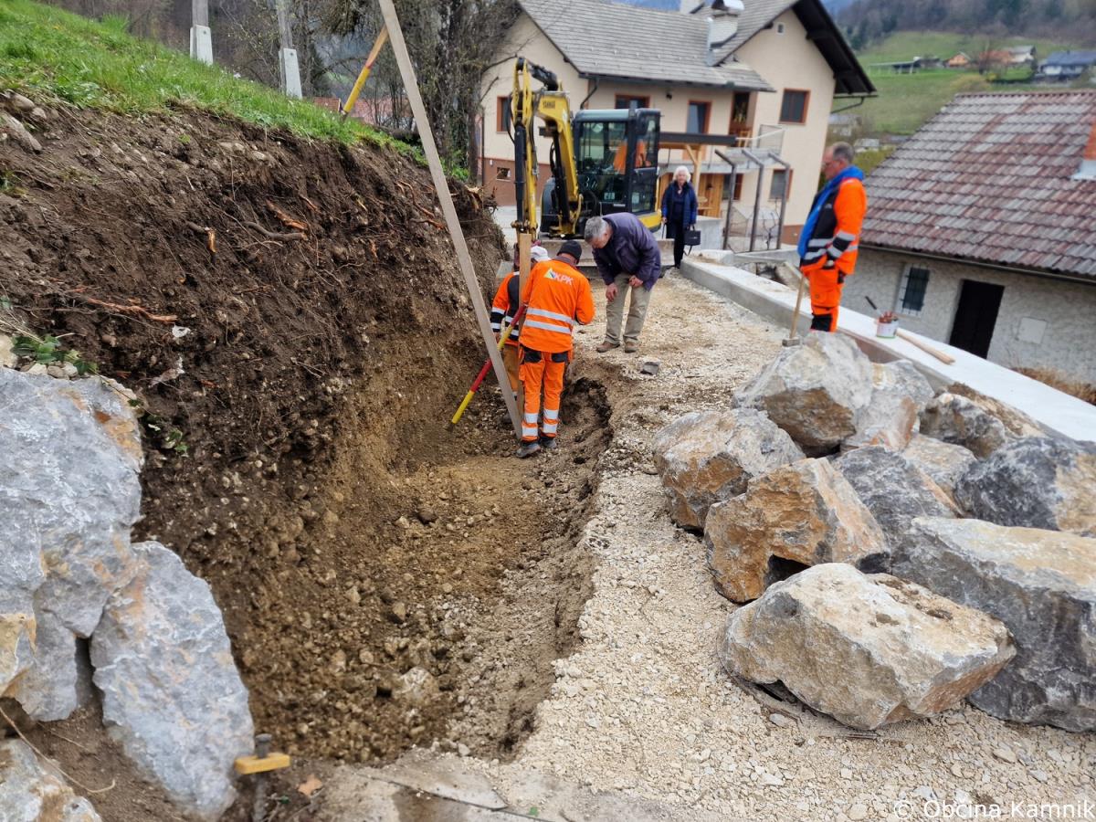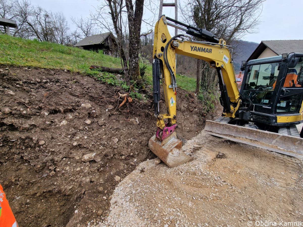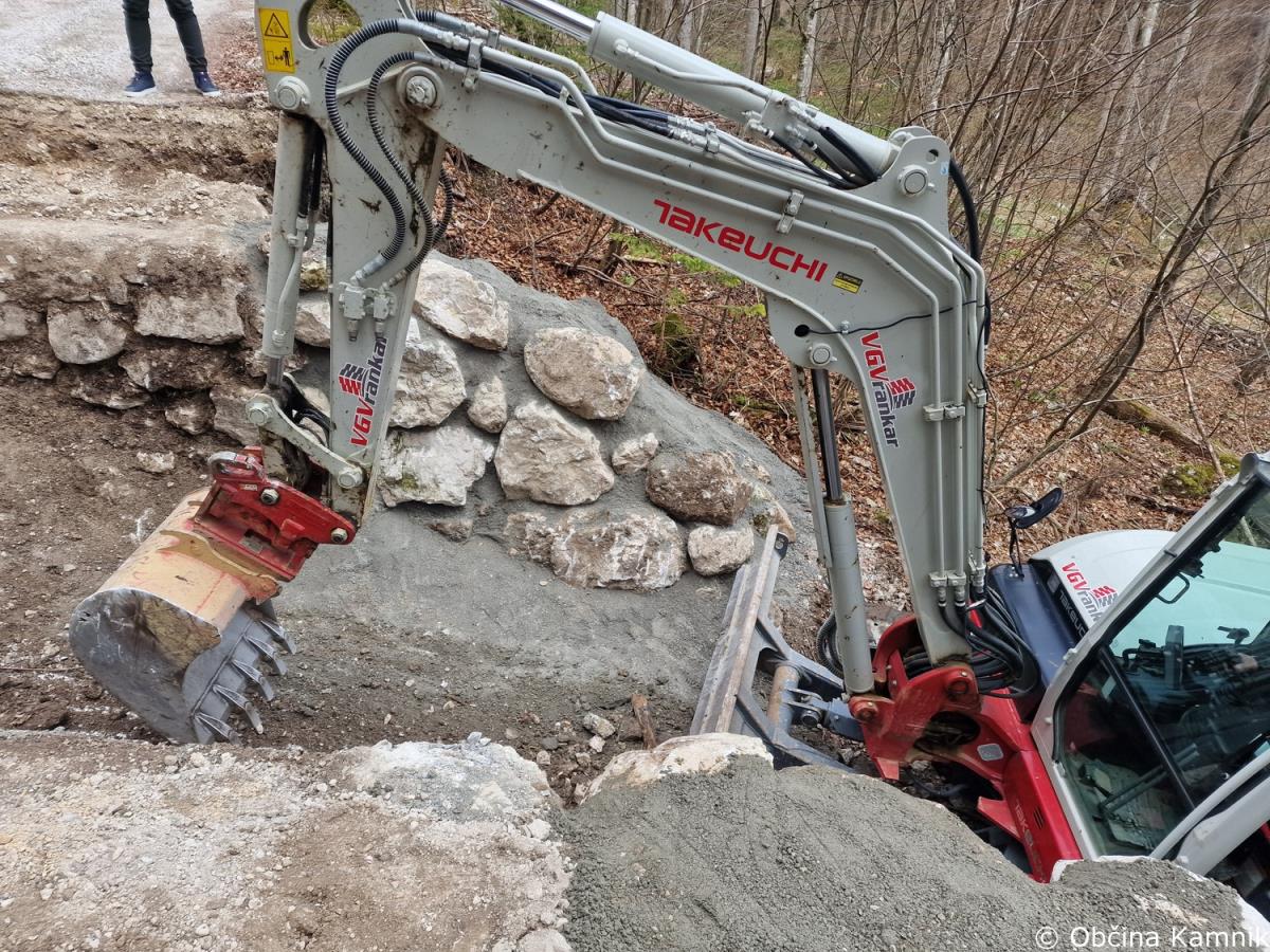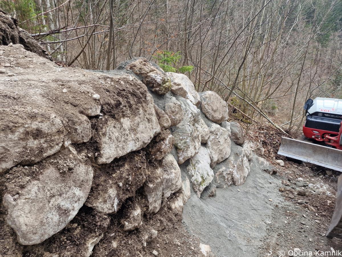 Sanacija zajema izgradnjo oporne konstrukcije, kamniti oporni zid iz kamna v betonu dolžine 15 metrov in višine 2,6 metra, ureditev odvodnjavanja, zavarovanje ukopne brežine nad cesto ter obnova cestišča. Trenutno se izvajajo dela nad cesto, kjer se bo izvedlo zavarovanje ukopne brežine. Izvajalec del je Komunalno podjetje Kamnik, d. o. o., vrednost sanacije pa znaša 18.269 evrov.