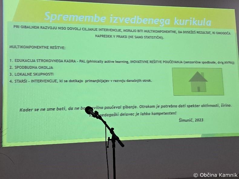 V nadaljevanju so predavatelji prof. dr. Boštjan Šimunič, izr. prof. dr. Uroš Marušič, dr. Matej Plevnik in Tatjana Jakovljević, univ. dipl. prof. defektologije predstavili nevarnosti gibalne neaktivnosti v vzgoji in izobraževanju, kako obogateno okolje in gibanje vpliva na razvoj možganov otrok, kako pomemben je gibalni razvoj otrok v predšolskem obdobju in kaj pomenijo stimulativna učna okolja.