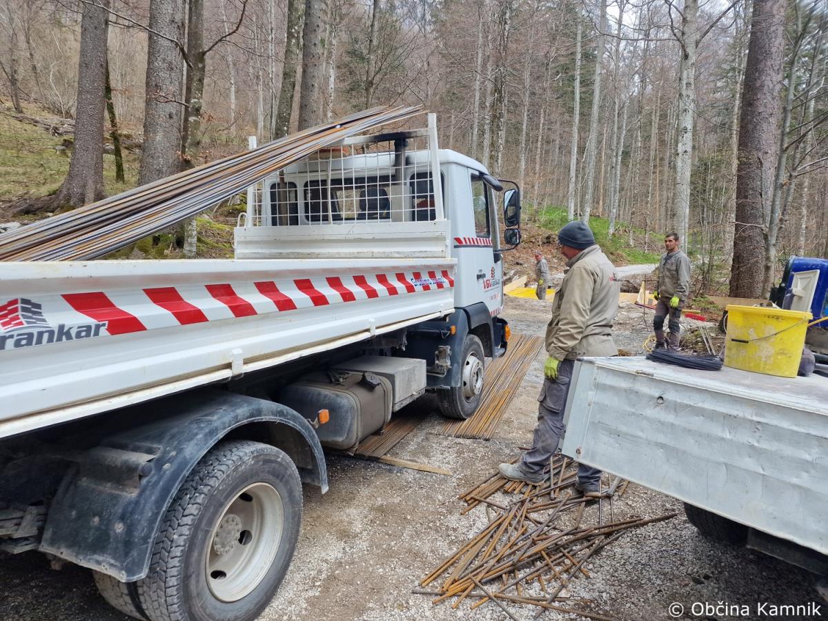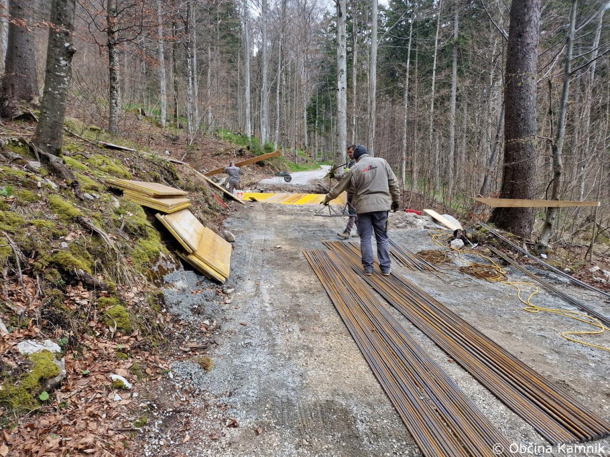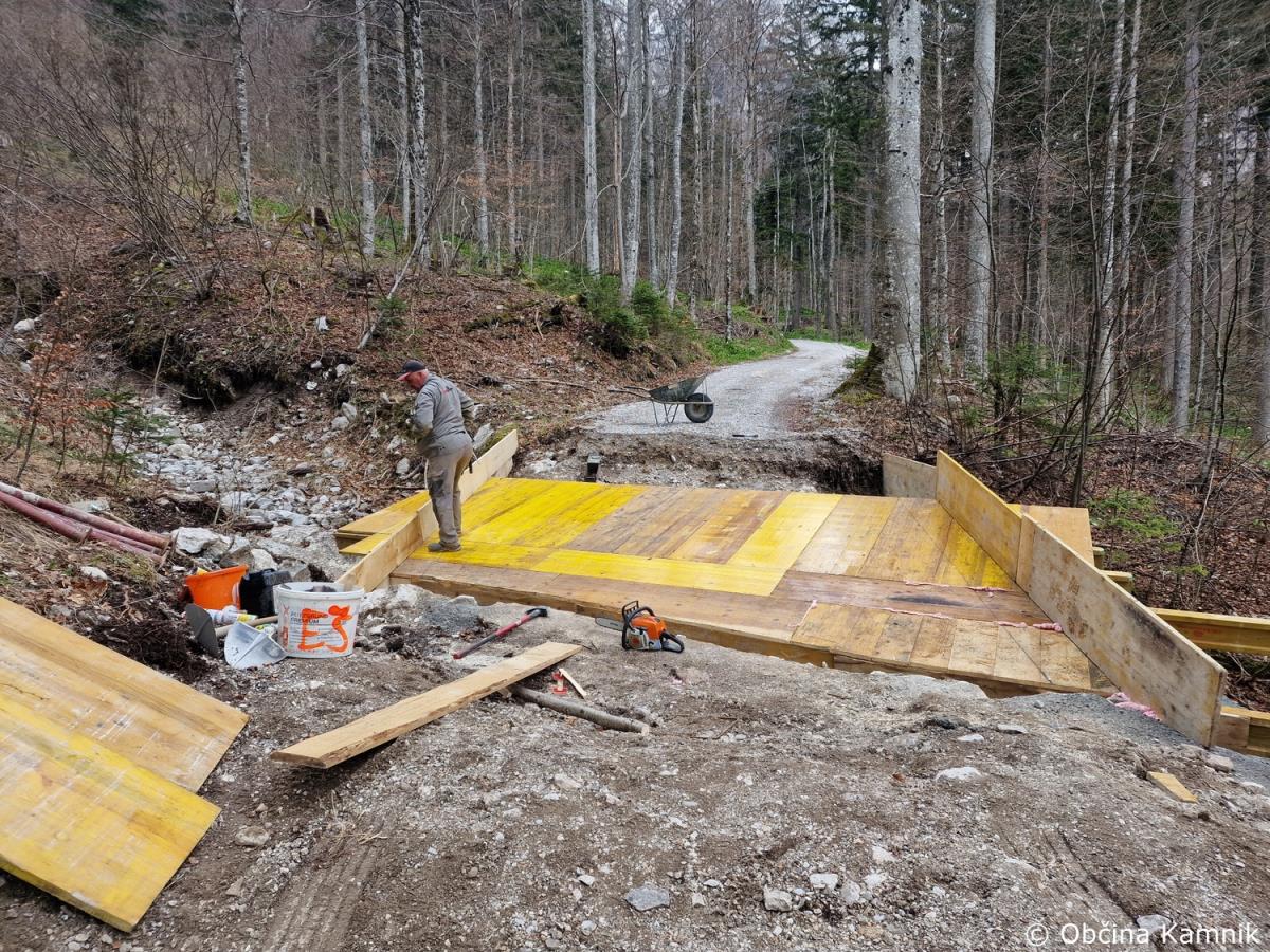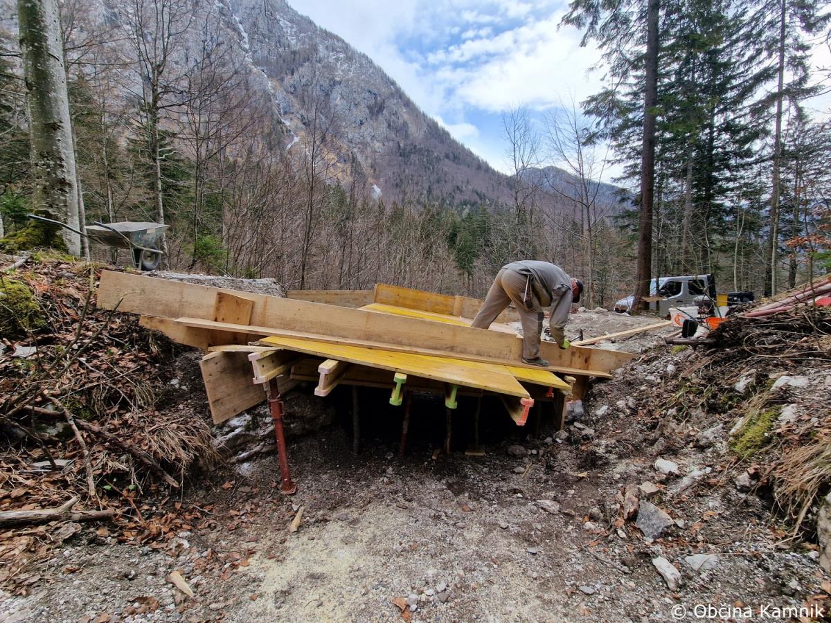 Na občinski cesti JP660727 Kamniška Bistrica, ki vodi do tovorne žičnice za Kokrsko sedlo, se nadaljuje sanacija treh mostov. Gradnja zajema ureditev opornikov mostu ter struge in postavitev treh novih mostov. Trenutno potekajo dela na drugem objektu mostu, kjer se pripravlja opaž, v katerega bo položena armatura, ki bo nato zalita z betonom.