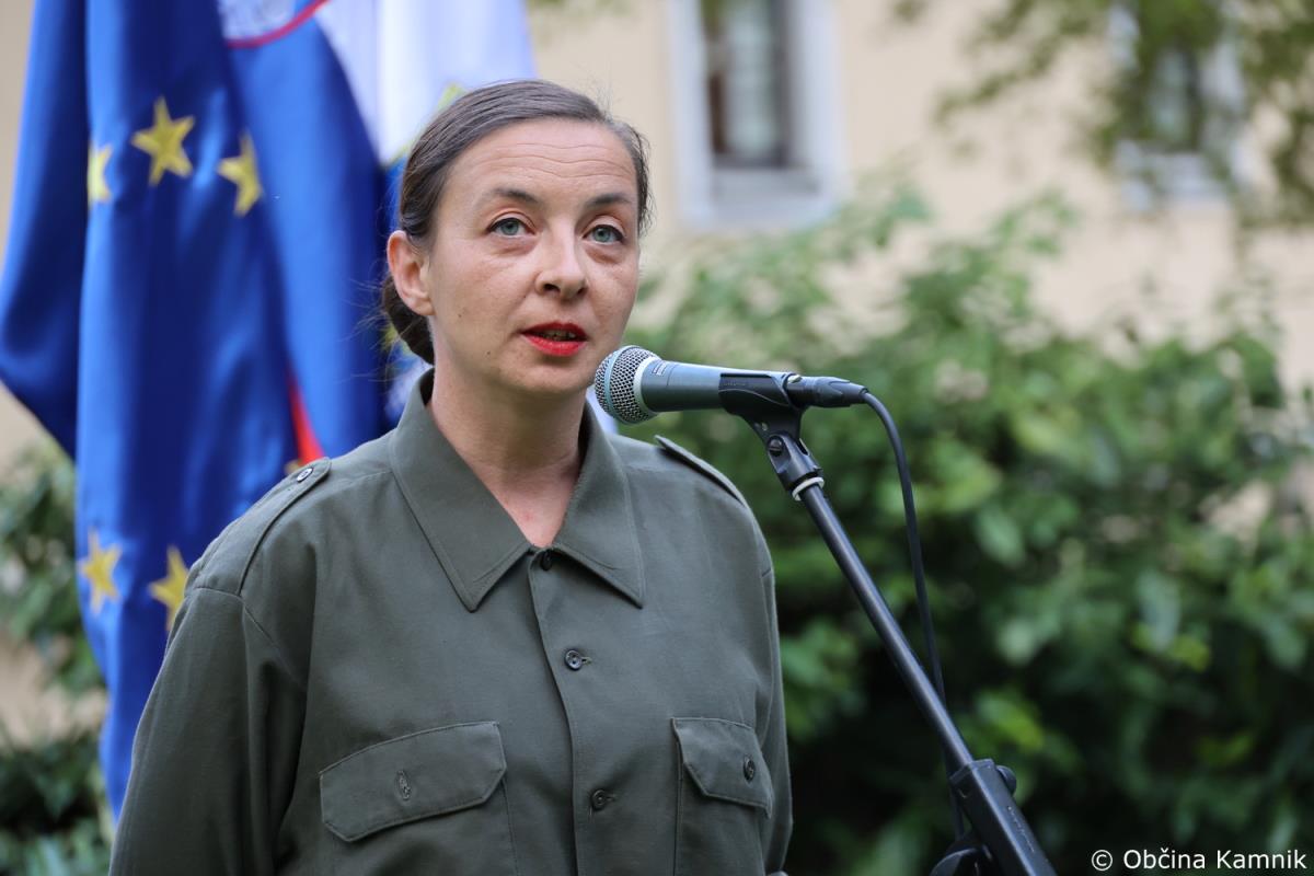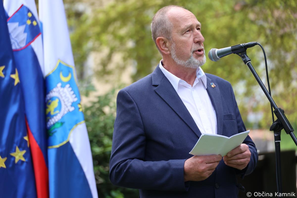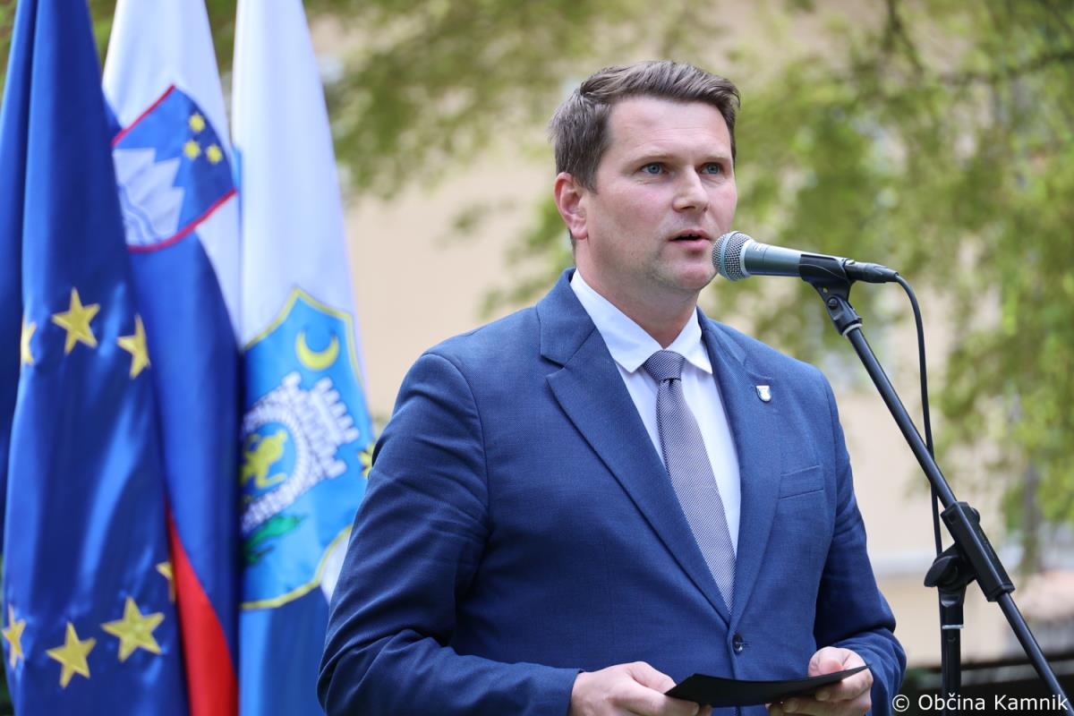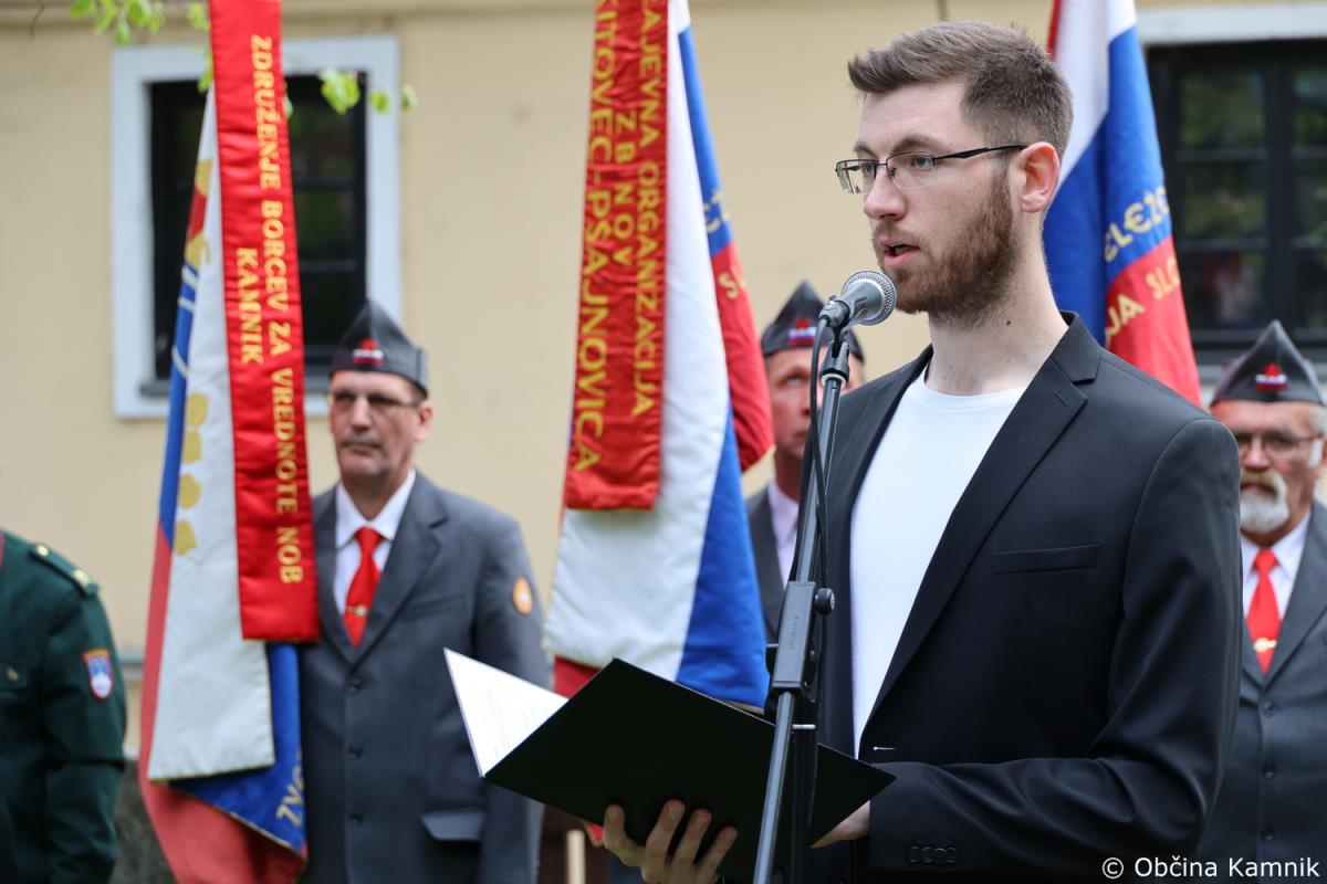 Da je praznik dan upora proti okupatorju dan, ko se spominjamo preteklih dogodkov, ki jih ne smemo nikoli pozabiti in nanje opozarjati, je v pozdravnem nagovoru dejal župan Matej Slapar ter namenil misli o obnovi spomenika Revolucije: »Spoštovane gospe, spoštovani gospodje, tovarišice, tovariši, pred nami je pomemben dan, dan, ko se spominjamo pogumnih posameznikov in skupin, ki so se v zgodovini našega naroda borili proti različnim okupatorjem, ki so ogrožali naš narod kot tudi posameznice in posameznike. Kajti ko je ogrožen najmanjši del naroda, to je posameznik, takrat je ogrožen cel narod. In nikoli in nikdar ne smemo več dopustiti, da bi kdorkoli ogrožal ustvarjalnost, samoiniciativnost, kot tudi možnosti razvoja posameznika in posameznice, ki smo sestavni del našega naroda. Kajti, ko se zatre ustvarjalnost se zatre želja po razvoju in napredku in to na koncu zaduši razvoj skupnosti, ki se ji reče narod. Ponosen sem, da po vseh vojnah in po vseh razhajanjih in nesoglasjih, ki so (še posebej v prejšnjem stoletju) zaznamovale naš narod, lahko danes samozavestno rečemo, da živimo v svobodni, suvereni državi, kjer lahko vsak posameznik izživi in izkoristi svoje potenciale. In to svobodo moramo ohraniti za naše zanamce. Da bo svobodna podjetniška, ustvarjalna in zasebna pobuda, da bo vsak lahko razvil svoje talente do te mere, da bo lahko dostojno živel na biseru pod nebom in da bo temu biseru s ponosom rekel domovina. Da bo Slovenija tudi v prihodnje država poštenih in delavnih ljudi, ki o svoji usodi odloča samostojno in suvereno. Čez nekaj trenutkov, bomo položili venec k spomeniku žal pred kratkim preminulega avtorja, akademskega kiparja Draga Tršarja, kateri je bil postavljen leta 1962. Zob časa je spomenik, ki ponazarja bronasto skulpturo v obliki ptice, z razpetimi krili, sestavljenih iz shematičnih človeških figur, ki ponazarjajo pogum, vztrajnost ter borbenost do zadnjega, dodobra načel. Zato smo na Občini Kamnik, takoj ob zaznanih razpokah sklicali vse potrebne institucije ter rezervirali finančna sredstva, da bomo spomenik v doglednem času dostojno in primerno obnovili. Ker gre za zahtevne in drage restavratorske posege, smo konec lanskega leta na Ministrstvo za kulturo podali vlogo za pridobitev sredstev za interventni ukrep varstva spomenika, vendar s strani ministrstva še nismo dobili odgovora. V začetku tega leta smo podali tudi prijavo na razpis pristojnega ministrstva za kulturo, in sicer za sofinanciranje spomeniško-varstvenih projektov na področju ohranjanja nepremičnih spomenikov. Rezultati razpisa še niso bili objavljeni. Predvidevamo, da bomo demontažo in prestavitev skulpture v delavnico izvedli v tem letu, v tem in naslednjem letu pa bodo v nadaljevanju potekala restavratorska dela. Občina Kamnik se zaveda likovne in kulturne vrednosti spomenika, ki predstavlja pomembno delo priznanega slovenskega avtorja, hkrati pa vrhunsko dopolnjuje ambient mesta v parku Evropa, ki se nahaja tik ob starem mestnem jedru in je pravzaprav pomemben element prepoznavne mestne vedute. Vsekakor gre tudi v slovenskem merilu za vrhunsko in prepoznavno umetniško delo, zato pričakujemo tudi finančno pomoč države. Spoštovane in spoštovani, iskrene čestitke ob prihajajočih praznikih, dnevu boja proti okupatorju, kot tudi ob mednarodnemu prazniku dela. S ponosom praznujmo dosežke, ki smo si jih kot narod priborili in zavedajmo se tega, da se boj za pravičnost in svobodo nikoli ne konča. Le skupaj lahko premagamo ovire in prepreke, naši cilji pa naj bodo usmerjeni v sodelovanje, razvoj, pravičnost in solidarnost. Za svetlo prihodnost nas vseh in našega, slovenskega naroda. Slava vsem, ki so se borili za svobodno Slovenijo. Hvala.«