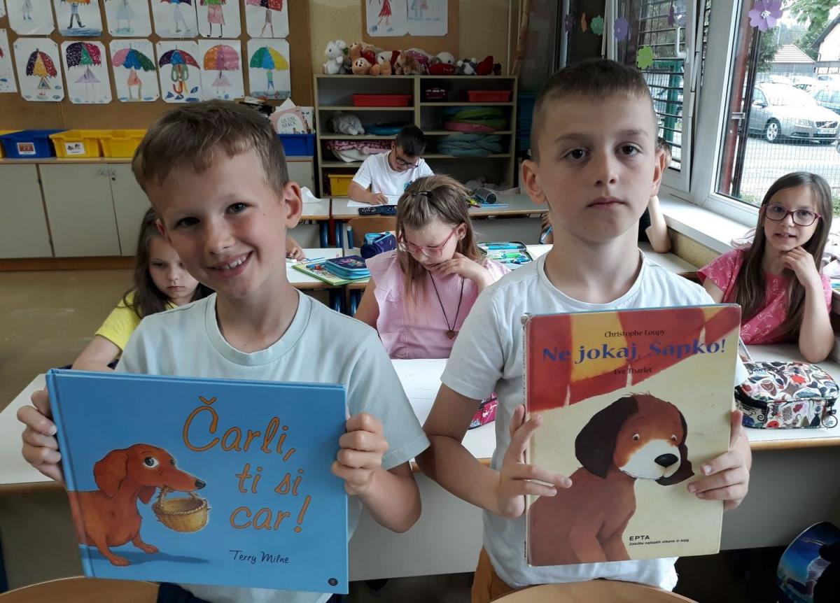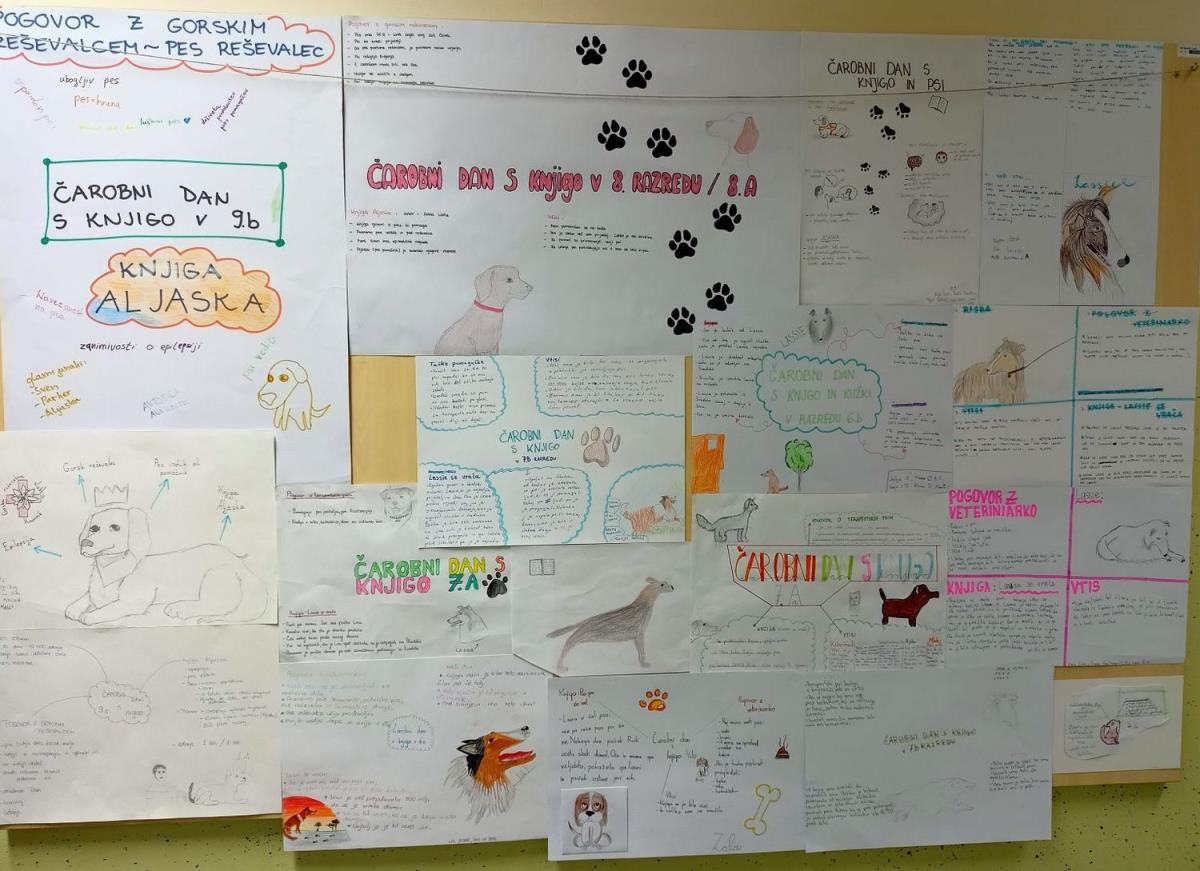 Učenci od 1. do 7. razreda so nato z učitelji v razredu glasno brali knjige, v katerih so bili glavni junaki kužki. Tako so šesto- in sedmošolci spoznali znamenito Lassie, v nižjih razredih pa številne druge pasje junake. Osmošolci so prisluhnili predstavitvi knjige, ki sta jo pripravili Tanaja Gavez iz 8. a in Zoja Vršič iz 8. b, za devetošolce pa sta se pripravila Vanja Težak iz 9. a in Anže Berlec iz 9. b. Predstavili so knjigo Aljaska nizozemske pisateljice Anne Woltz, v kateri ima glavni junak epilepsijo, zato ima ob sebi psičko Aljasko, ki ga lahko opozori na napad. Tako so učenci spoznali še pse vodnike in pomočnike.