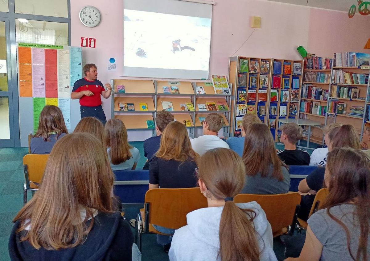 Osmošolci in devetošolci so v knjižnici poslušali zanimivo predstavitev psov reševalcev. Obiskal nas je namreč gorski reševalec Marko Petek in s seboj pripeljal svojo psičko reševalko.