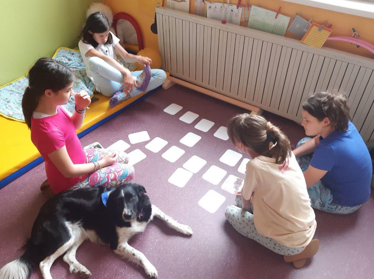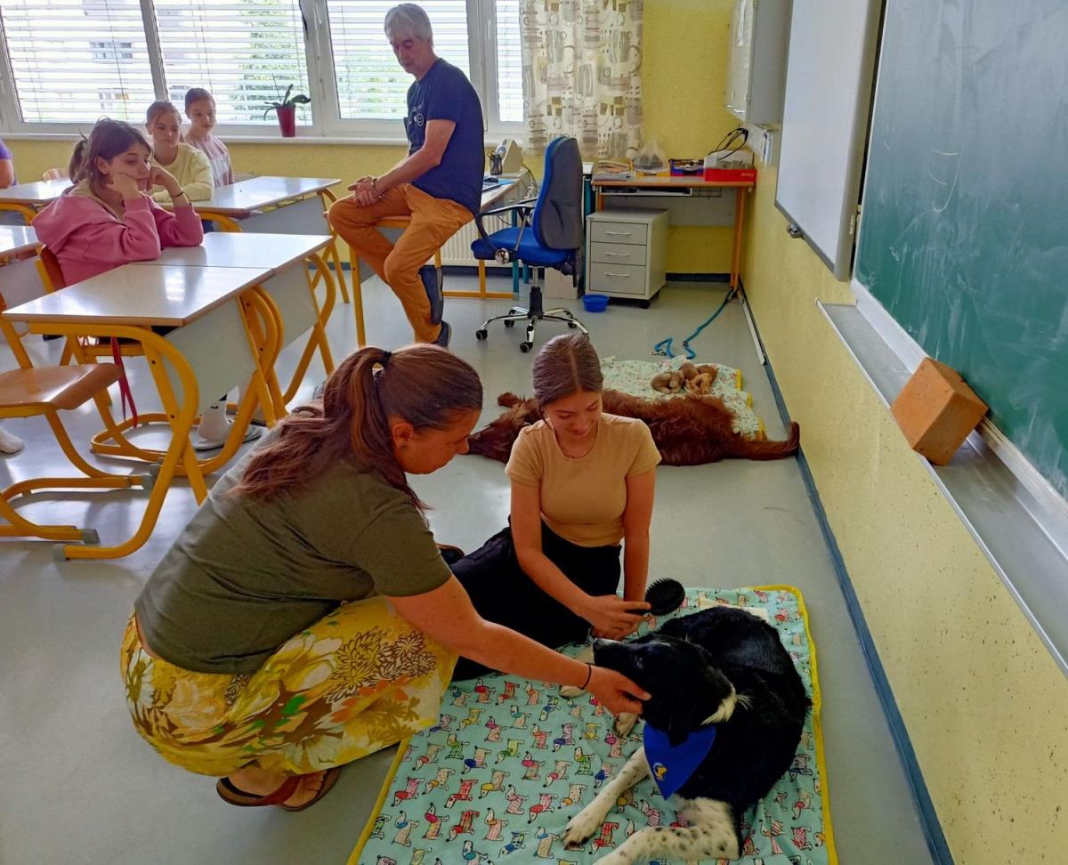 Sedmošolci so se družili z našo specialno pedagoginjo Katarino Kesič Dimic in učiteljem geografije Matjažem Reisnerjem ter njunima terapevtskima kužkoma Rozi in Lordom. Oba kužka sta večkrat gosta na naši šoli, vendar sedmošolcev še nista obiskala v sklopu kakšne delavnice. Tako so na ta dan tudi oni prišli na svoj račun. Z Rozi pa so se imeli priložnost med rekreativnim odmorom družiti tudi učenci, ki so se vpisali na sproščanje v kabinetu Katarine Kesič Dimic.