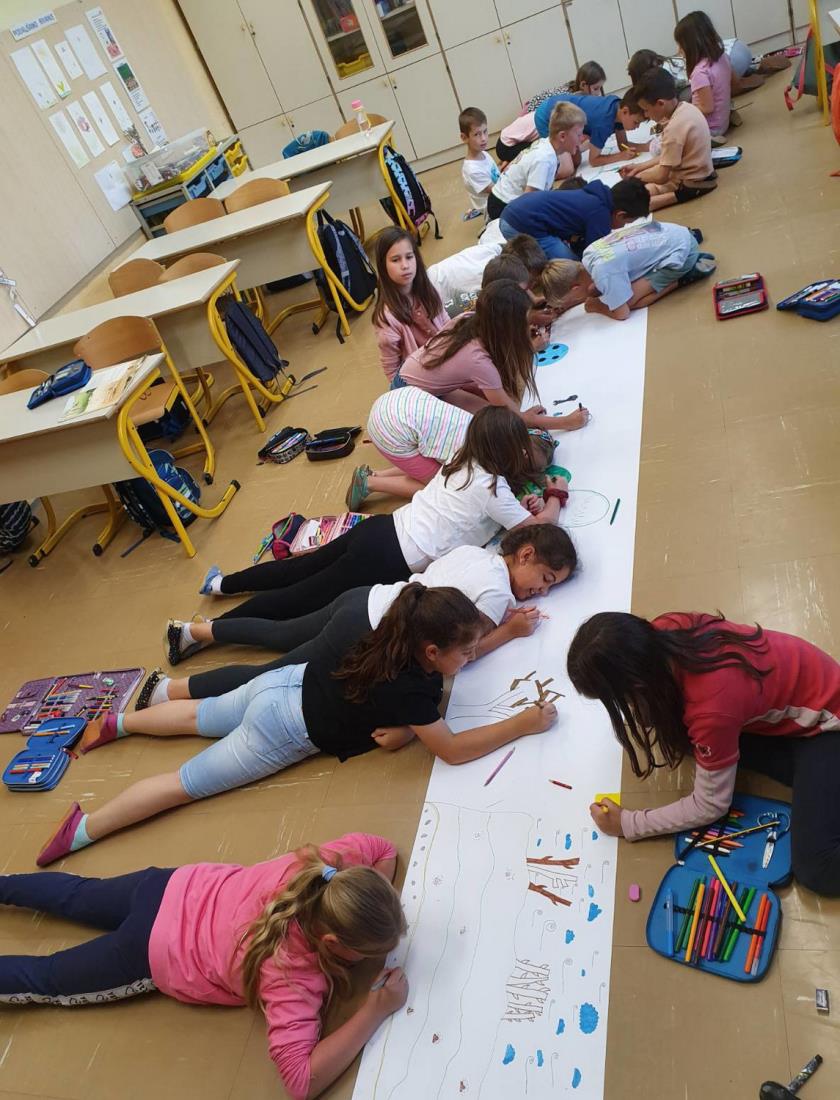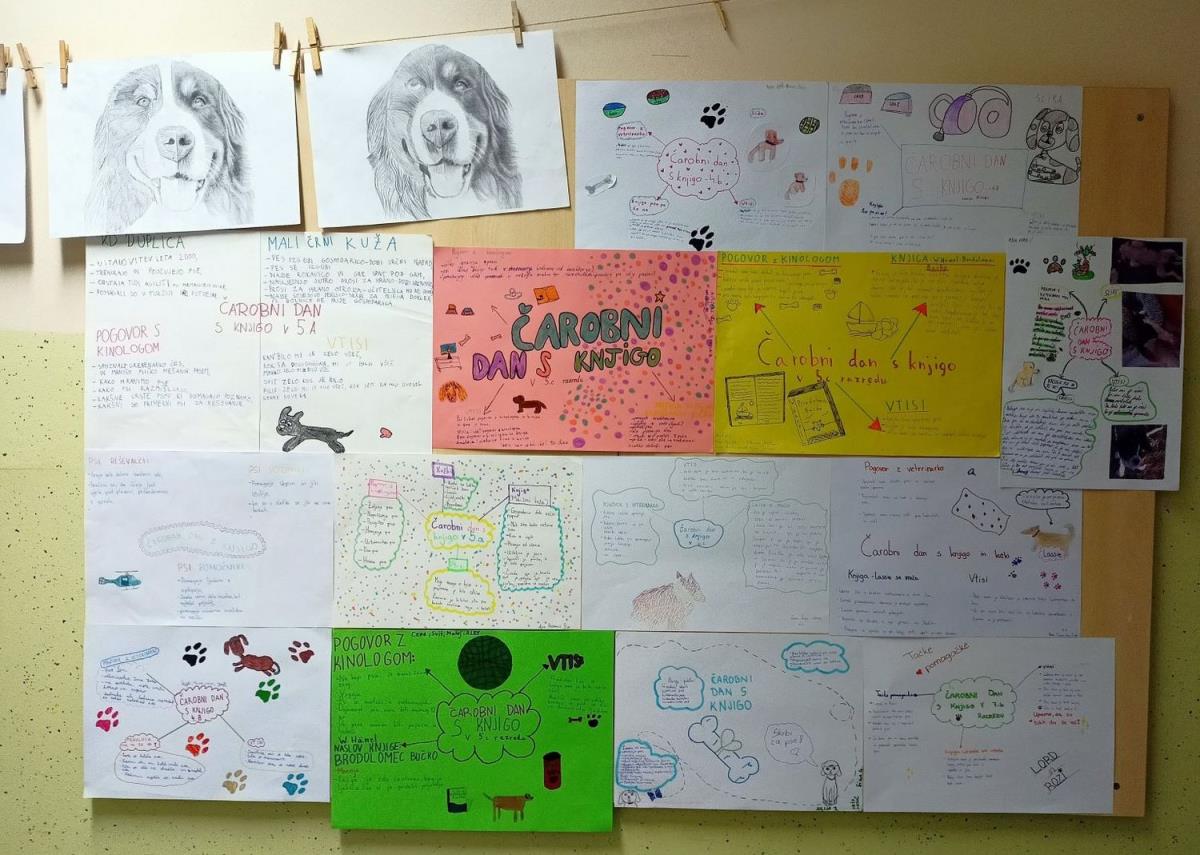 Učenci prve triade so risali, izdelovali kužke ali pisali zgodbice o njih, učenci 2. in 3. triade pa so nova spoznanja in svoje vtise strnili na plakate, ki so razstavljeni na hodniku pred knjižnico in v njej.