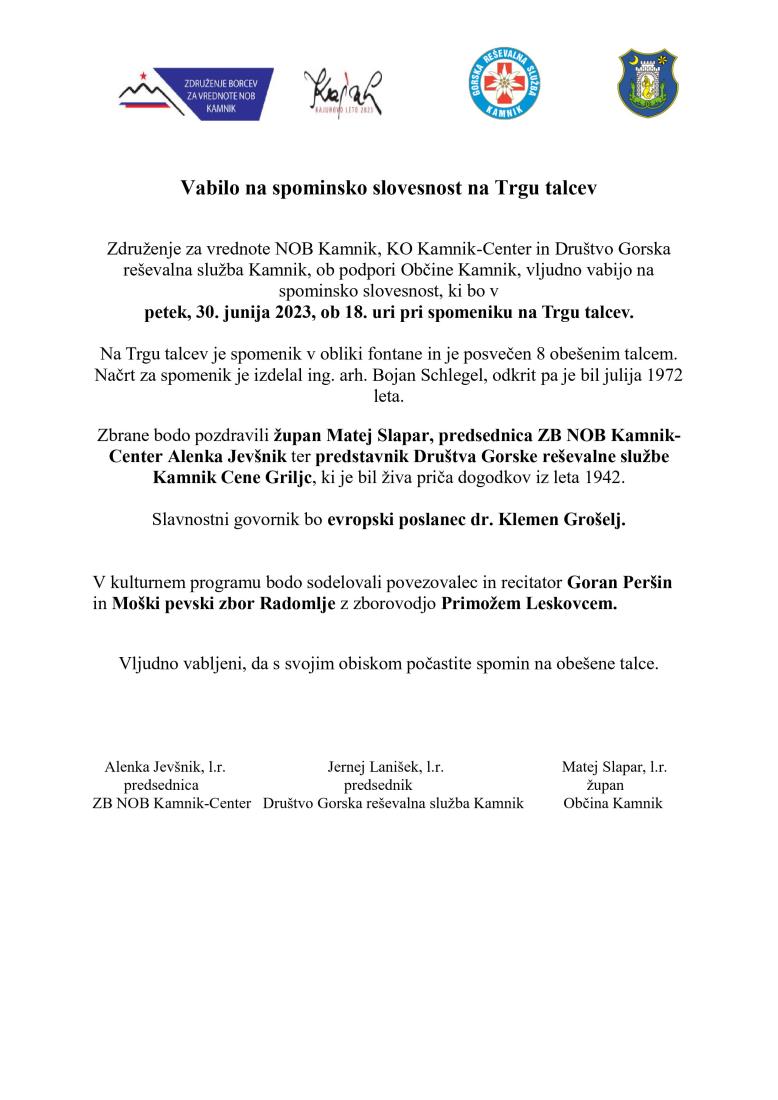 Združenje za vrednote NOB Kamnik, KO Kamnik-Center in Društvo Gorska reševalna služba Kamnik, ob podpori Občine Kamnik, vljudno vabijo na spominsko slovesnost, ki bo v petek, 30. junija 2023, ob 18. uri pri spomeniku na Trgu talcev.
