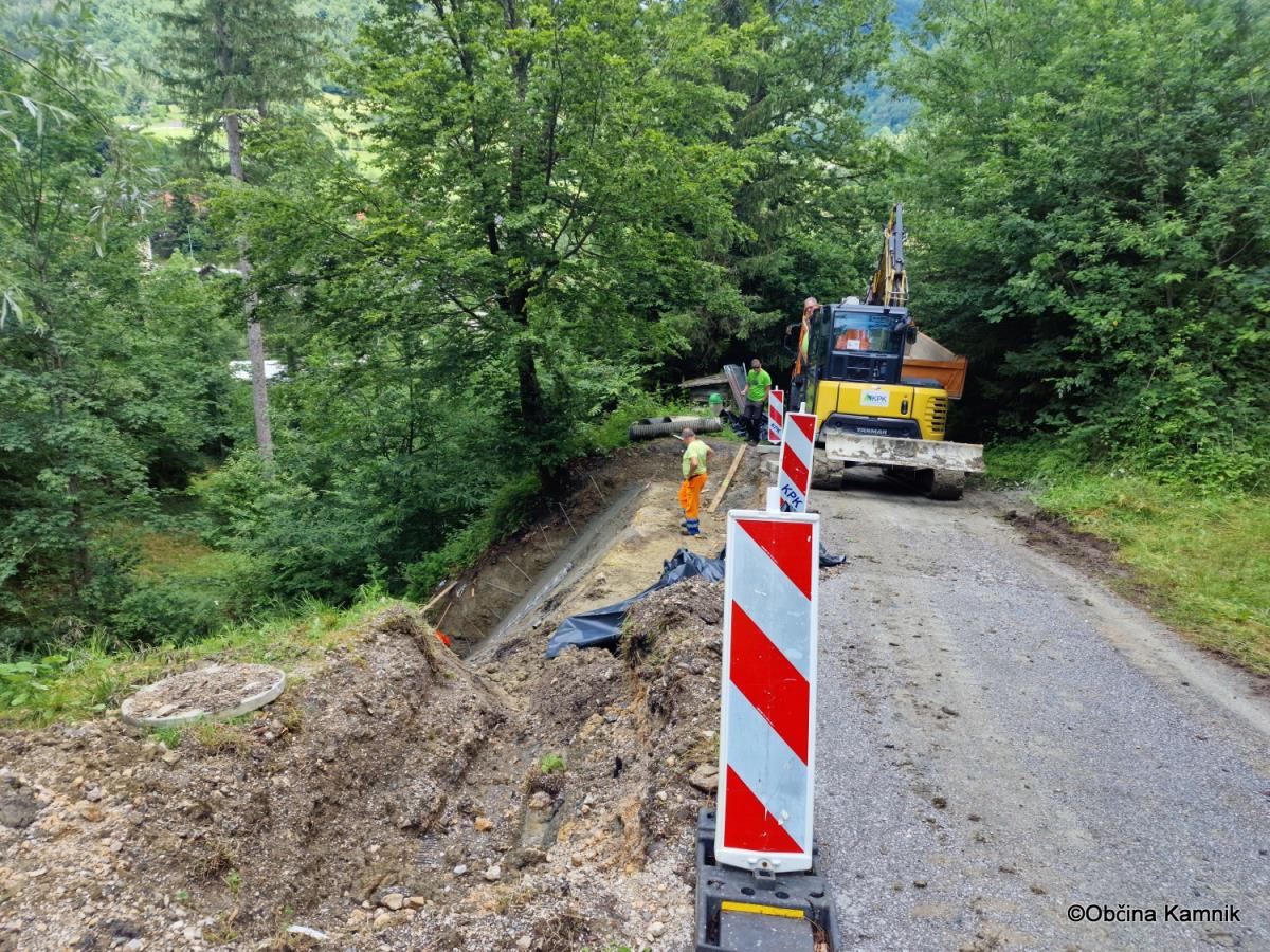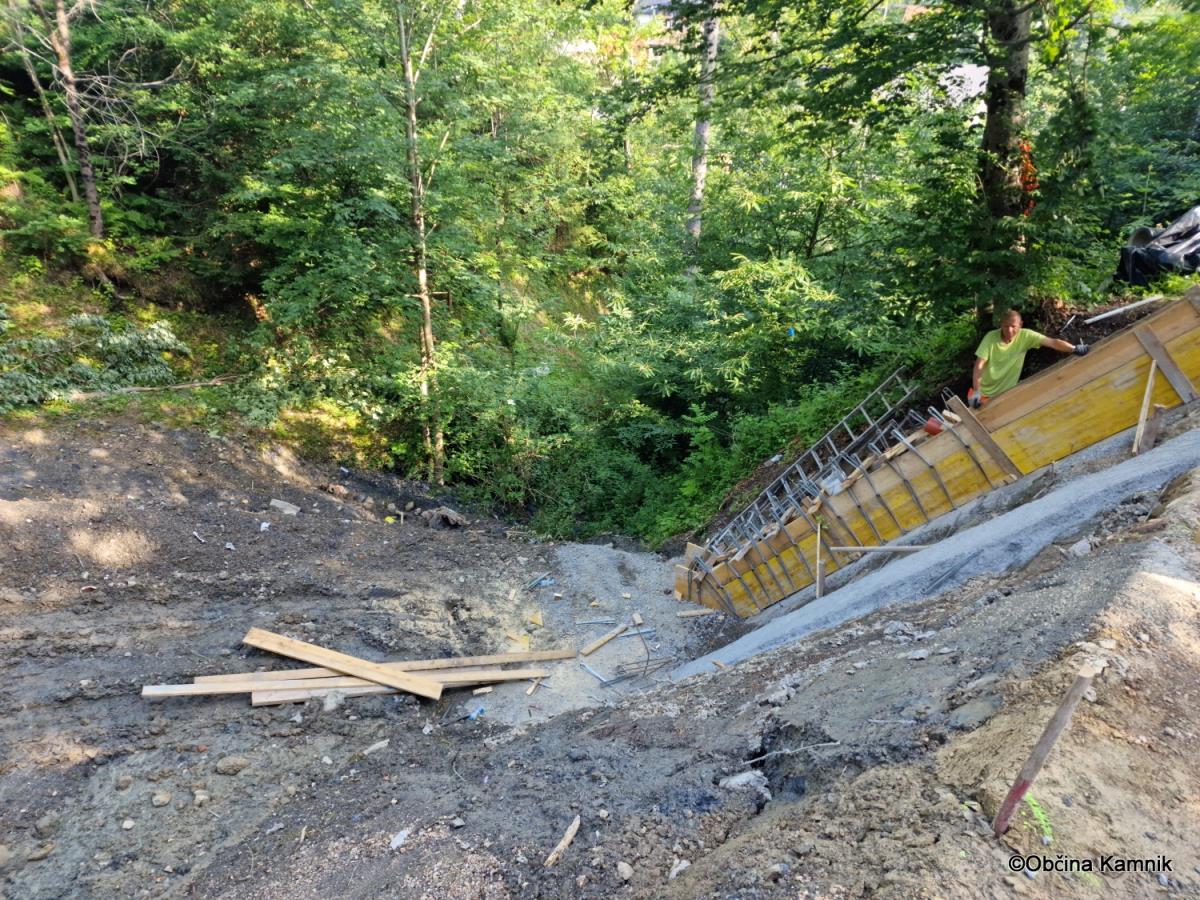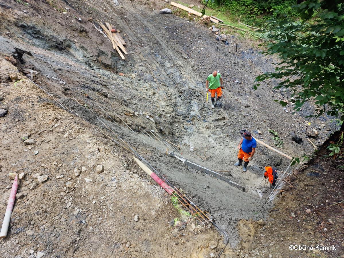 Sanacija zemeljskega plazu pod občinsko cesto JP661345 Laze-Vrhač, v kraju Laze v Tuhinju poteka po terminskem planu del. Na podlagi predhodno izvedenih geomehanskih raziskav terena je bila izdelana PZI dokumentacija za sanacijo plazu. Sanacija bo zajemala kombinacijo kamnite zložbe v dolžini 8 metrov in sidranih AB slopov s kamnito oblogo dolžine 6,5 metra, ki bo injektirana z geotehničinimi sidri dolžine 12 metrov, nosilnosti 200 Kn. V sklopu sanacije bomo izvedli in uredili odvodnjavanja meteorne vode, hudourniške kanalete dolžine 15 metrov, sanacija prepusta in obnovo vozišča. Gradbena dela izvaja Komunalno podjetje Kamnik d.o.o. Vrednost investicije znaša 29.500 €.