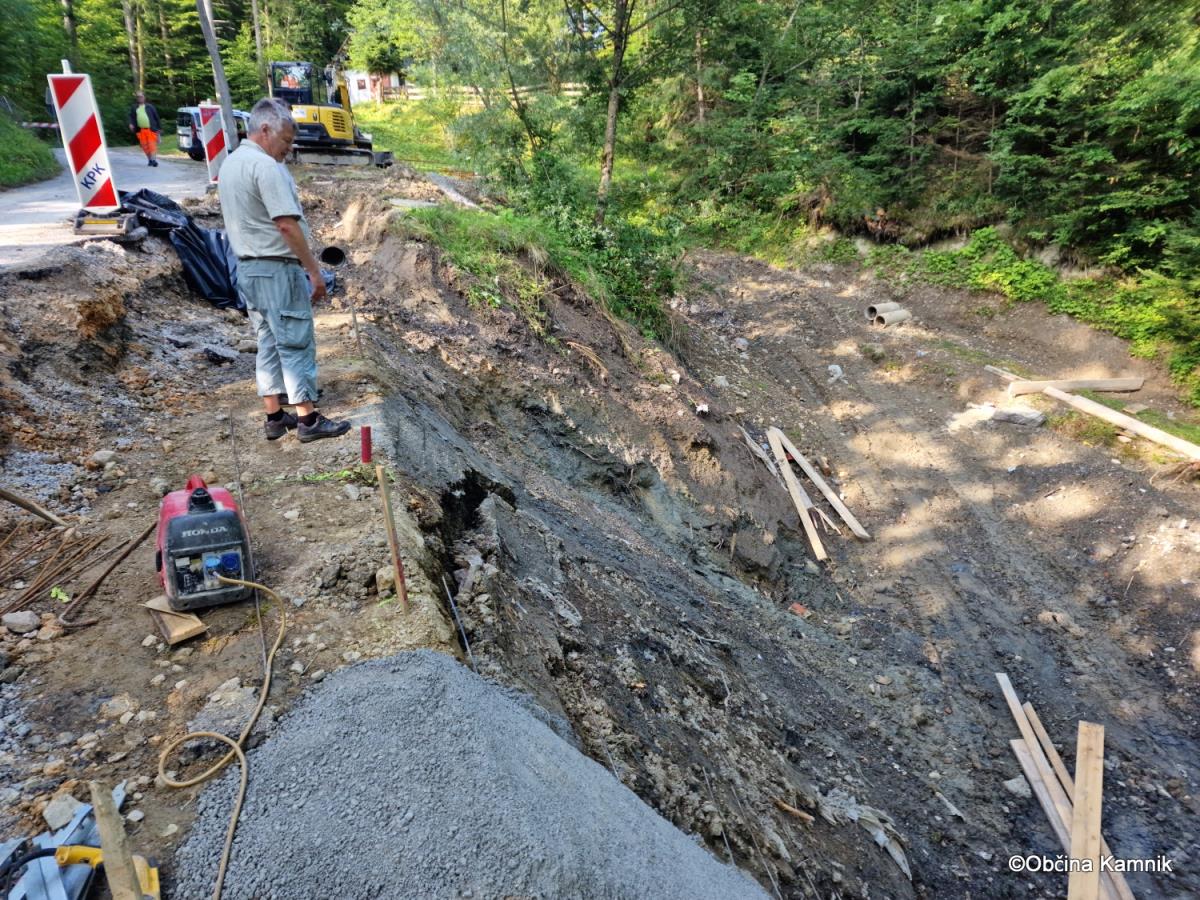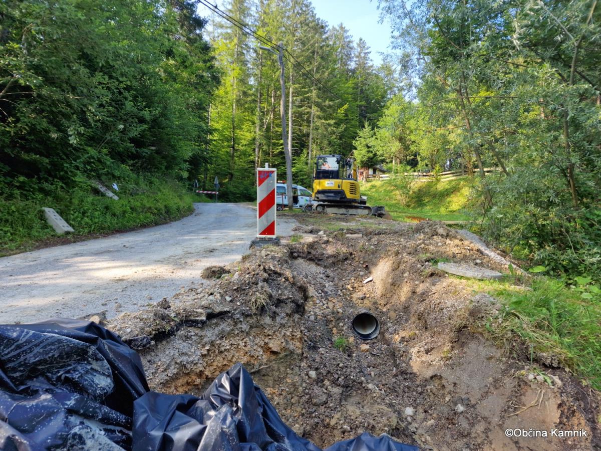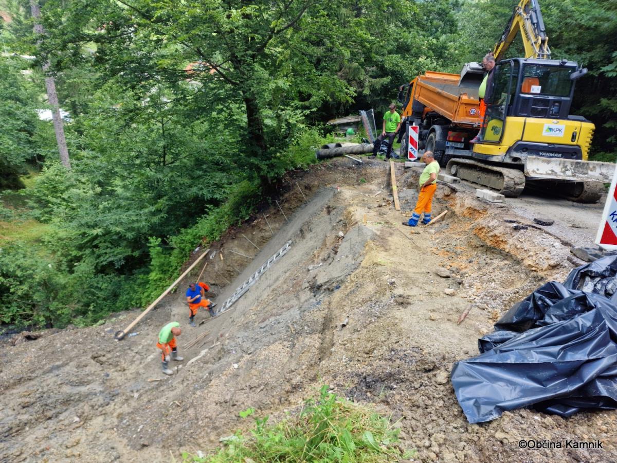 Sanacija zemeljskega plazu pod občinsko cesto JP661345 Laze-Vrhač, v kraju Laze v Tuhinju poteka po terminskem planu del. Na podlagi predhodno izvedenih geomehanskih raziskav terena je bila izdelana PZI dokumentacija za sanacijo plazu. Sanacija bo zajemala kombinacijo kamnite zložbe v dolžini 8 metrov in sidranih AB slopov s kamnito oblogo dolžine 6,5 metra, ki bo injektirana z geotehničinimi sidri dolžine 12 metrov, nosilnosti 200 Kn. V sklopu sanacije bomo izvedli in uredili odvodnjavanja meteorne vode, hudourniške kanalete dolžine 15 metrov, sanacija prepusta in obnovo vozišča. Gradbena dela izvaja Komunalno podjetje Kamnik d.o.o. Vrednost investicije znaša 29.500 €.