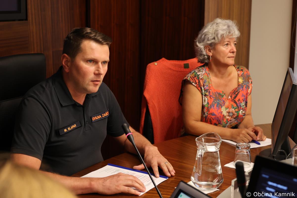 Župan Matej Slapar je ob današnji seji dejal: »Prizadela nas je povodenj, ki je našo občino prizadela tako, kot še nikoli. Takšnih podorov skal in poplav ter katastrofe še ni bilo. Uničilo je štiri doline, področje Tunjiščice, Bistričice, Kamniške Bistrice, iz nje smo evakuirali preko 200 turistov, in doline Črna, kjer so bile od sveta odrezane vse hiše, dobršen del pa zasute tudi do 1 metra. Območje Krivčevega je bilo zasuto skoraj v celoti, v Potoku v Črni pa so bile tudi zasute hiše do 1 metra. Dežja, ki je padal iz 3. na 4. avgusta, je bila ogromno, voda je drvela proti Kamniku in poplavila južni del Kamnika in dobršen del Šmarce ter Nožic. Poplave so bile dveh vrst, in sicer južni del Kamnika je bil poplavljen in voda je odtekla, v severnem delu pa nam je zasulo določene vasi. Gre za ogromne količine materiala, ki je ogrozil vso infrastrukturo. Uničenih je bilo ogromno občinskih in državnih cest, velika škoda je bila na vodotokih, ki so uničeni, brežine so razjedane in naslednje deževje, če ne bomo hitro pristopili k sanaciji, lahko ponovno ogrozijo določene objekte. Gasilci so začeli delo takoj, aktivna so bila pogodbena podjetja, Elektro Ljubljana je zagotavljala takojšnjo sanacijo izpadov. Hvala ekipam, ki so delale noč in dan, na terenu je bilo ogromno gradbene mehanizacije in ogromno prostovoljcev. Dela bo še ogromno na vodotokih in zagotovitvi poplavne varnosti, a smo na pravi poti, da bomo tudi tistim ljudem, ki ne bodo mogli živeti v svojih hišah skupaj rešili problem. V tej katastrofi se je pokazala tudi izjemna solidarnost. Pomagali so gasilci, kmetje, gradbena podjetja, vojska, gorski reševalci, sosedje, prostovoljci. Stopili smo skupaj. Jutri odpiramo začasni most Stranje. Verjamem, da bomo kmalu sestavili nazaj večino, preostali del vodotokov, ki so v upravljanju države, pa verjamem, da bo le ta pristopila z učinkovitim pristopom in tudi v prihodnje gradila v sodelovanju z Občino.«
