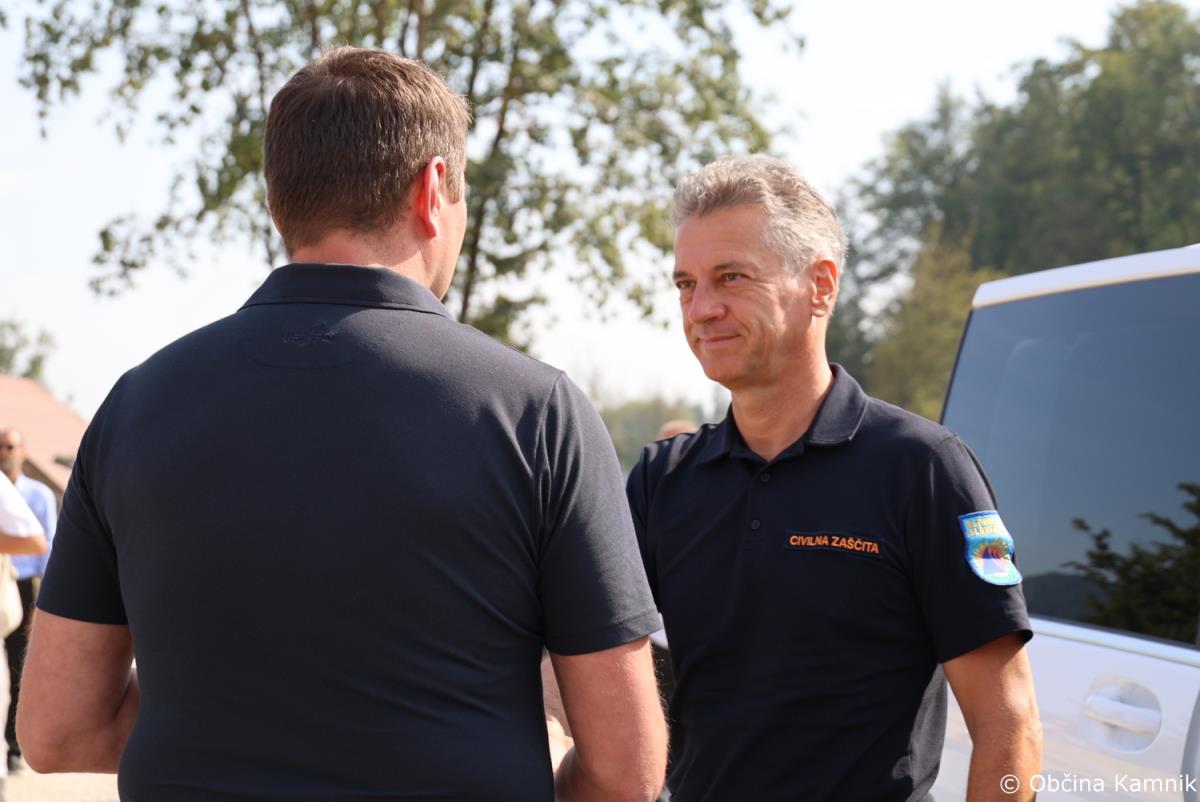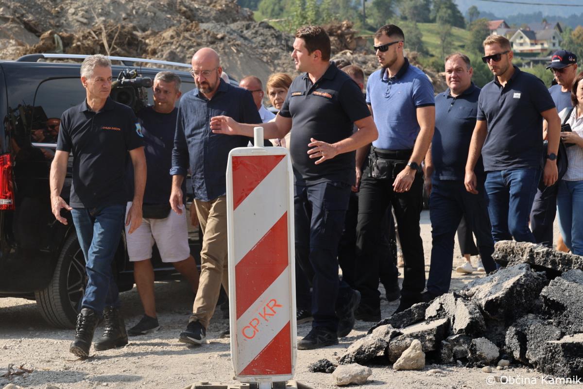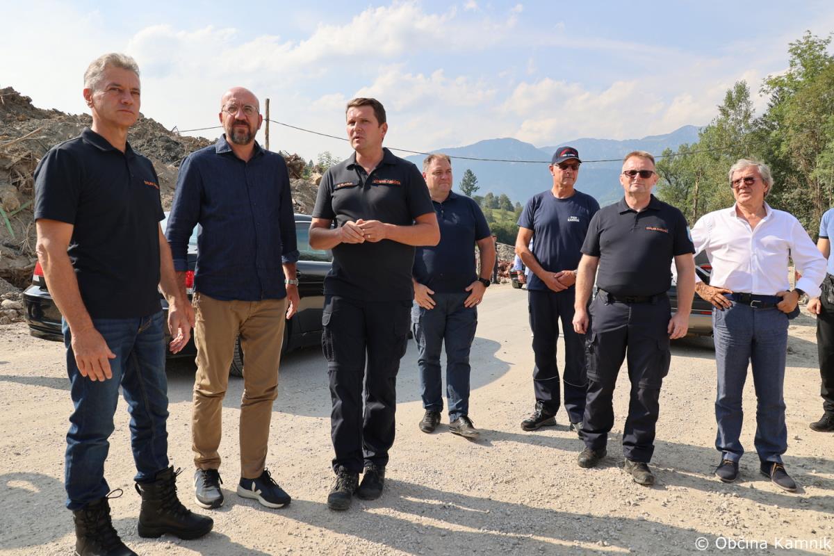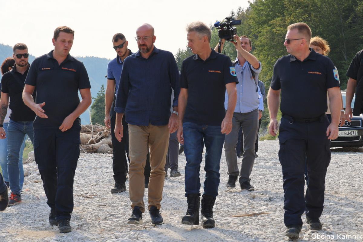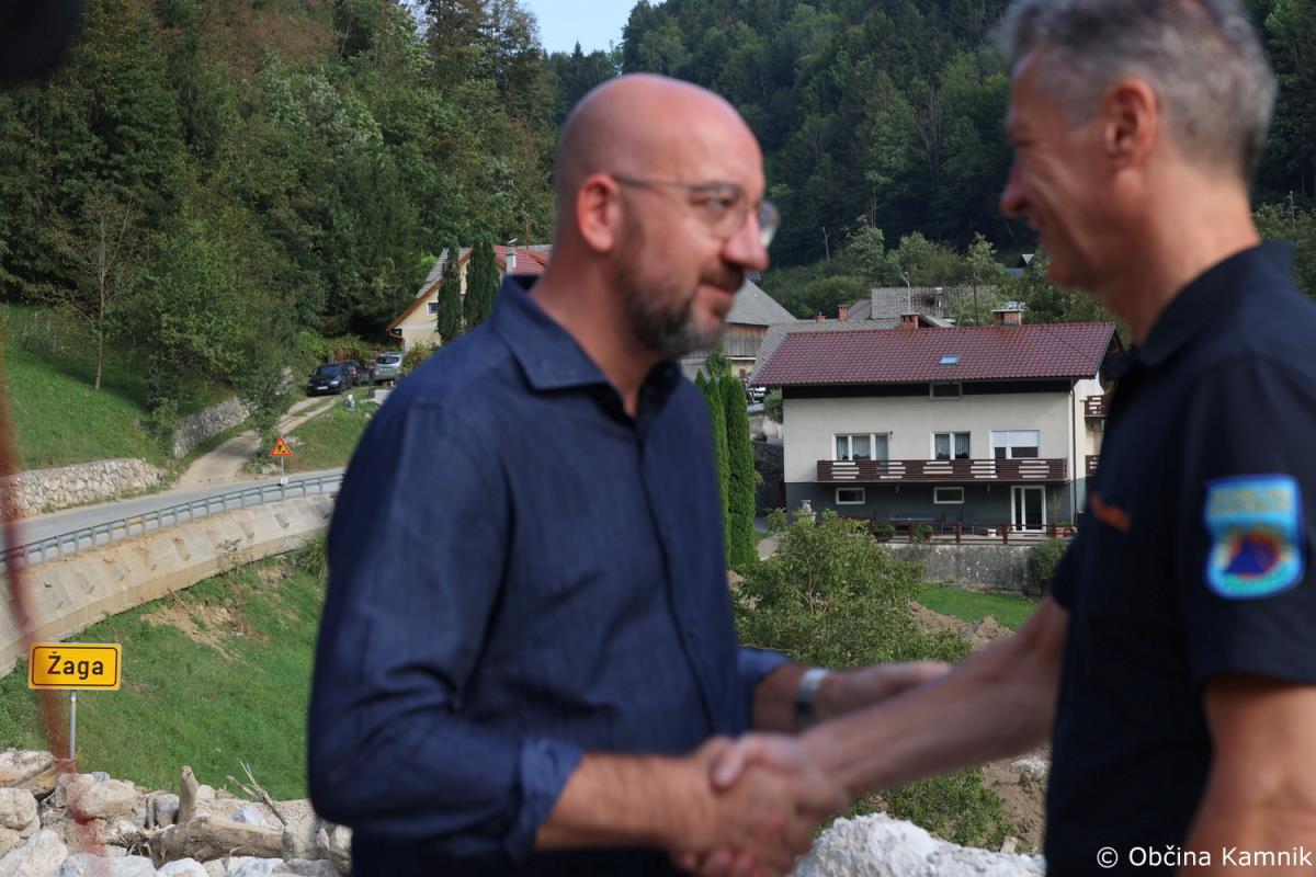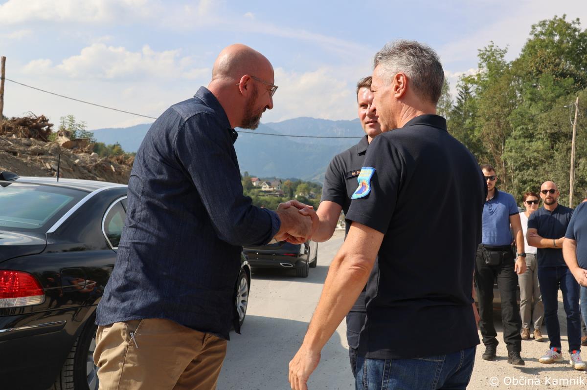 Predsednik Vlade Republike Slovenije dr. Robert Golob in predsednik Evropskega sveta Charles Michel sta si danes ogledala nekatera v poplavah prizadeta območja v občini Kamnik, sprejeli pa so jih župan Matej Slapar, podžupan Uroš Pirc in vodja intervencije, predsednik Prostovoljnega gasilskega društva Kamnik Jože Oblak.
