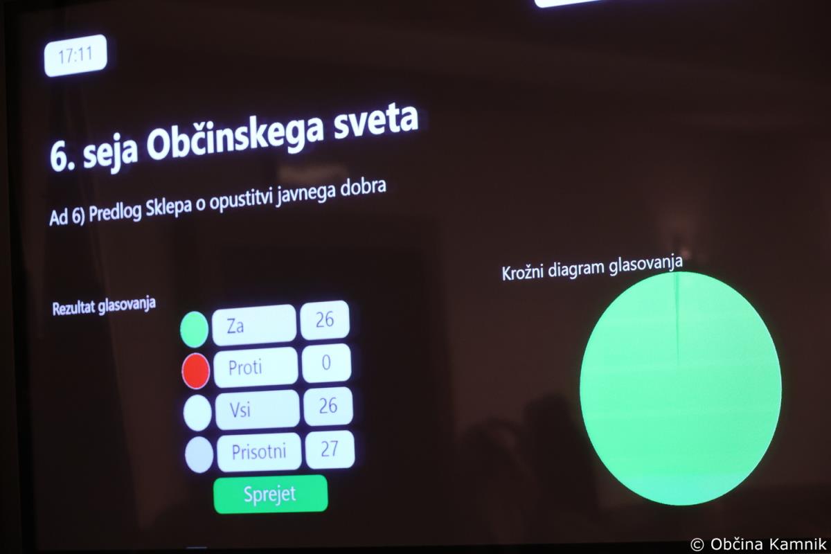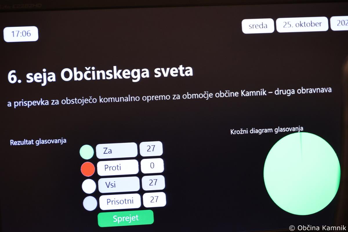 V drugi obravnavi je sledil s 27 glasovi za sprejem Odloka o podlagah za odmero komunalnega prispevka za obstoječo komunalno opremo za območje občine Kamnik. Namen programa opremljanja stavbnih zemljišč je analiza obstoječe komunalne opreme na območju OPN, uskladitev gradnje objektov in omrežij komunalne opreme ter pridobitev osnov za izvajanje obračuna komunalnega prispevka v skladu s trenutno veljavno zakonodajo. Program opremljanja določa usklajevanje dejavnosti povezanih s komunalnim opremljanjem stavbnih zemljišč za načrtovanje finančnih sredstev za opremljanje in omogočanje možnosti priključevanja na komunalno opremo ter služi kot podlaga za odmero komunalnega prispevka. »V drugi obravnavi so v Odlok vnesene naslednje spremembe tehnični popravki zaradi usklajevanja predloga Odloka z nadrejeno (nacionalno) zakonodajo – črta se drugi odstavek 1. člena, drugi odstavek 4. člena, dodan je 5. člen (ostali se temu primerno preštevilčijo), 15. člen se dopolni na način, da se vnesejo zakonsko dovoljene oprostitve, dodatno pa tudi, da se plačilo komunalnega prispevka za obstoječo komunalno opremo v celoti oprosti za gradnjo stavb sil za zaščito, reševanje in pomoč ter gasilskih domov – oznaka 12742 v skladu s klasifikacijo CC-SI,« je še poudarila vodja Oddelka za urejanje prostora dr. Marija Tadeja Ježek, nato pa je s 26 glasovi za sledil še sprejem Sklepa o opustitvi javnega dobra.