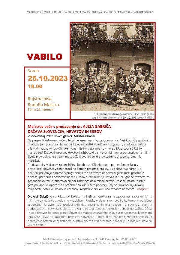 Na prvem Maistrovem večeru letošnje jeseni nam bo zgodovinar, dr. Aleš Gabrič z zanimivim predavanjem predstavil konec velike vojne, velikih prelomnih dogodkih, med katerimi sta bila tudi razpad Avstro-Ogrske monarhije in nastajanje novih mej. 29. oktobra 1918 je nastala tudi Država Slovencev Hrvatov in Srbov; ki pa ni bila niti mednarodna priznana niti ni živela prav dolgo, le en sam mesec. Za Slovence se je z rojstvom te države spremenilo marsikaj.