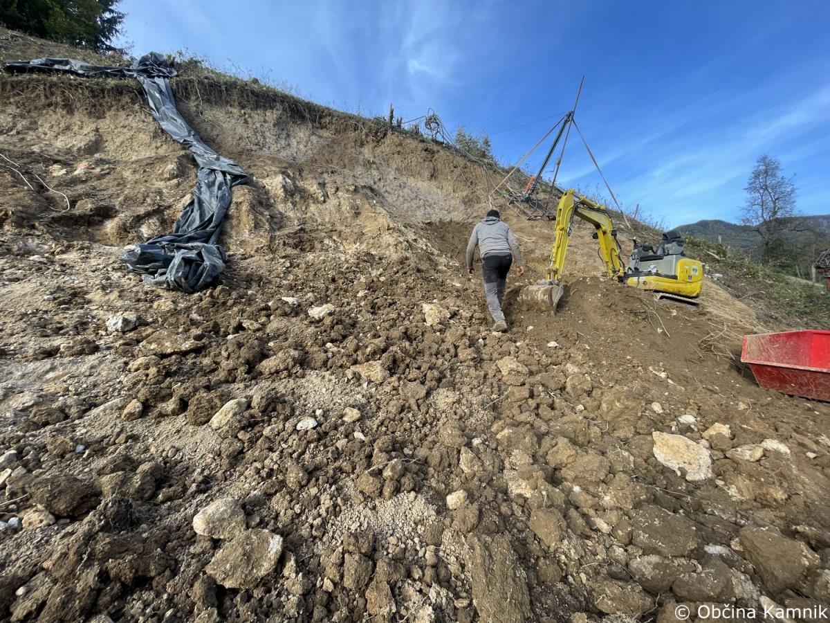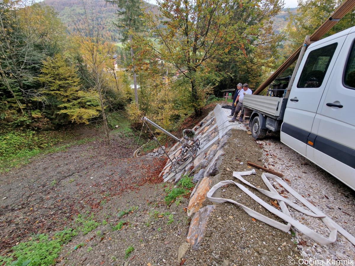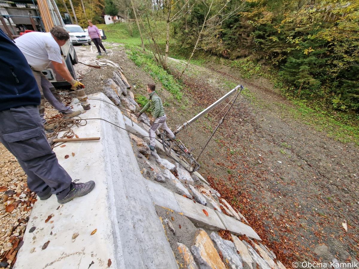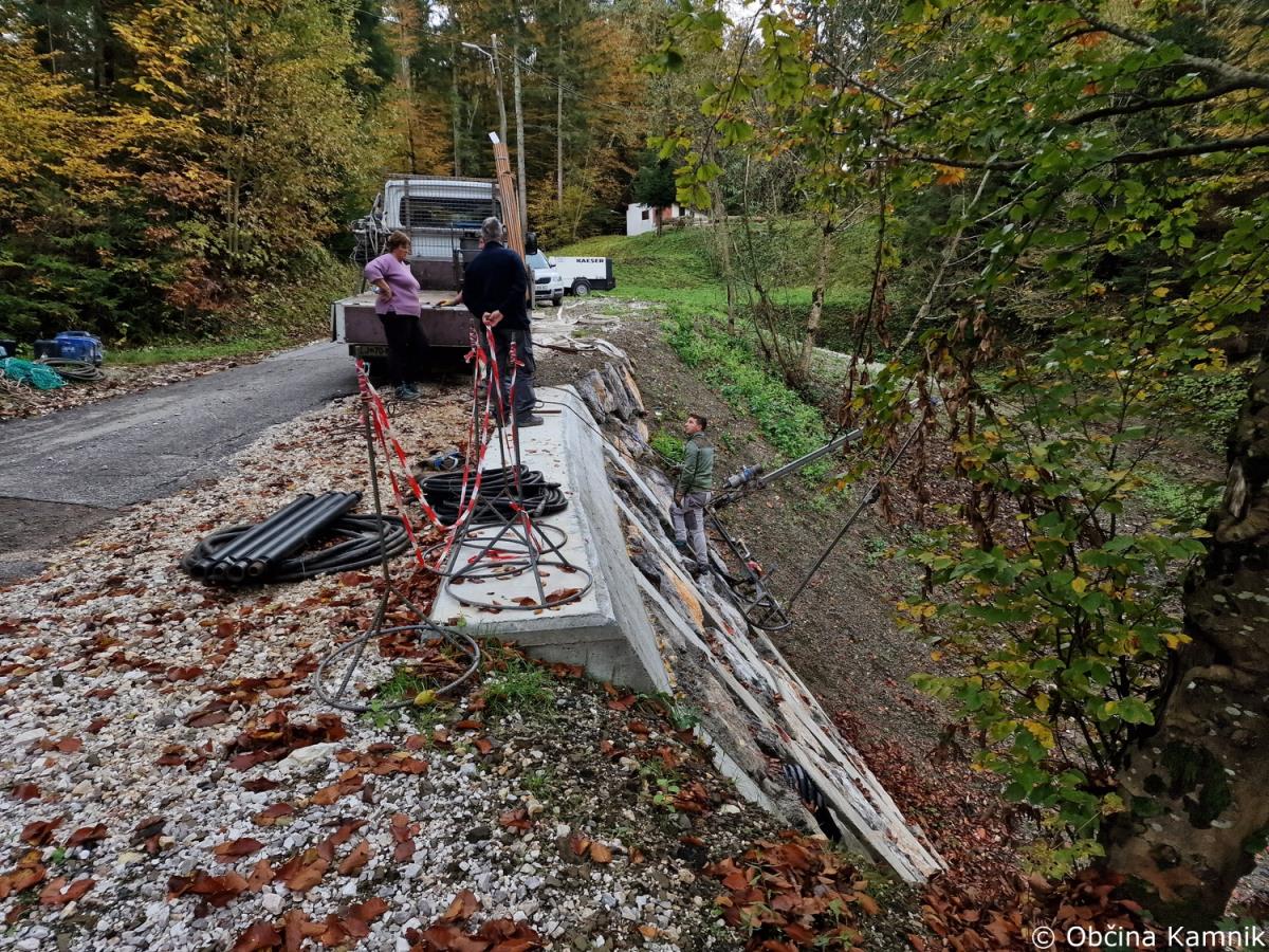 Sanacija zajema kombinacijo kamnite zložbe v dolžini 8 metrov in sidranih AB slopov s kamnito oblogo dolžine 6,5 metra. V sklopu sanacije smo izvedli in uredili odvodnjavanja meteorne vode, hudourniške kanalete dolžine 15 metrov, izvedena je bila sanacija prepusta. V preteklem tednu je bilo zaključeno injektiranje z geotehničinimi sidri dolžine 12 metrov, nosilnosti 200 Kn. Gradbena dela izvaja Komunalno podjetje Kamnik, d. o. o. gradbeni nadzor nad sanacijo izvaja geomehanik Martin Vrabec d. o. o., vrednost investicije pa znaša 29.500 evrov. Vse udeležence v cestnem prometu naprošamo, da dosledno upoštevajo postavljeno popolno zaporo in prometno signalizacijo.