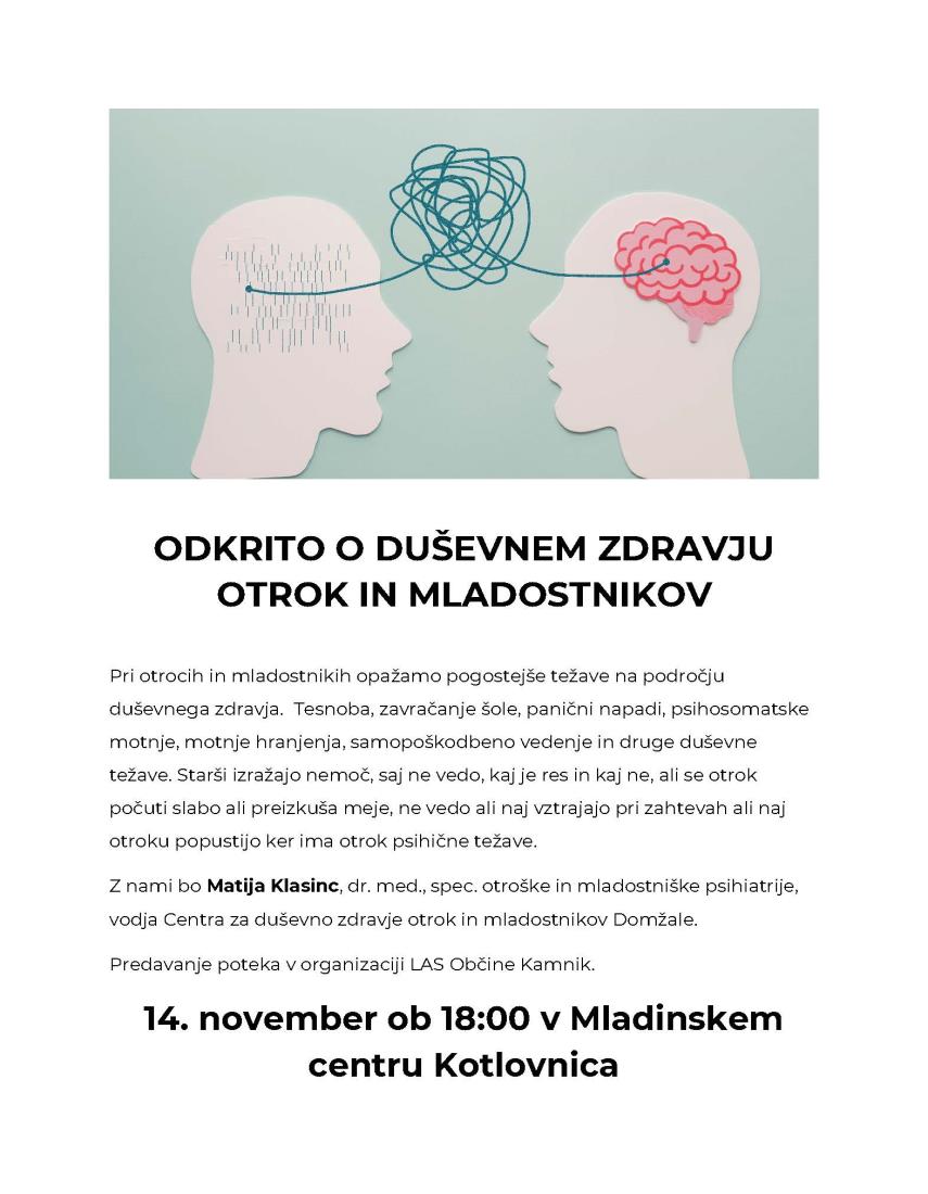V torek, 14. novembra 2023, se bo v MC Kotlovnica, ob 18. uri odvilo predavanje za starše, Odkrito o duševnem zdravju otrok in mladostnikov, v izvedbi Centra za duševno zdravje otrok in mladostnikov Domžale.