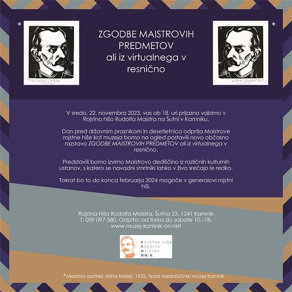 Na predvečer praznika, 22. novembra 2023, ob 18. uri odpiramo v njegovi rojstni hiši na Šutni v Kamniku, novo razstavo Zgodbe Maistrovih predmetov, iz virtualne na resnično in obenem praznujemo 10-letnico delovanja Rojstne hiše Rudolfa Maistra v Kamniku, ki je bila odprta 23. novembra 2013. Na ogled bomo postavili Maistrovo dediščino, ki nastopa na spletu v virtualni Maistrovi poti, projektu, ki ga je leta 2021 ustvarilo skupaj 15 kulturnih ustanov in družina Maister. Obiskovalci si bodo na razstavi lahko ogledali dragocene predmete in gradivo, kot so Maistrove knjige iz njegove znamenite knjižnice, njegova pisma, dokumenti, rokopisi … ter prisluhnili njihovim zgodbam. Avtorica razstave je Alenka Juvan, v sodelovanju s slovenskimi muzeji, arhivi in UKM.