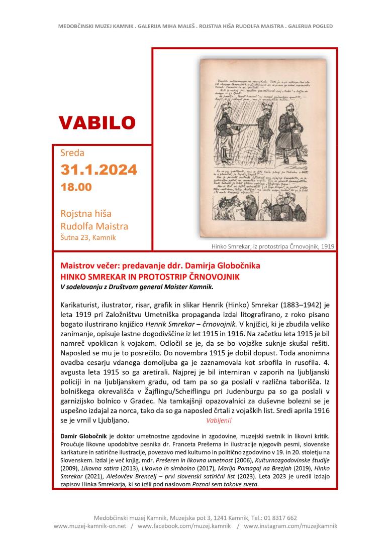 dr. Damir Globočnik nam bo na prvem Maistrovem večeru v letu 2024 predstavil knjižico, strip, protostrip pravzaprav – Hinko Smrekar, Črnovojnik, ki je izšel leta 1919 pri založništvu Umetniška propaganda. V njem je naš veliki slikar in ilustrator po končani prvi svetovni vojni lucidno, s švejkovskimi prijemi upodobil svojo usodo in zgodbe znanih Slovencev, tudi svojega dobrega prijatelja Ivana Cankarja.
