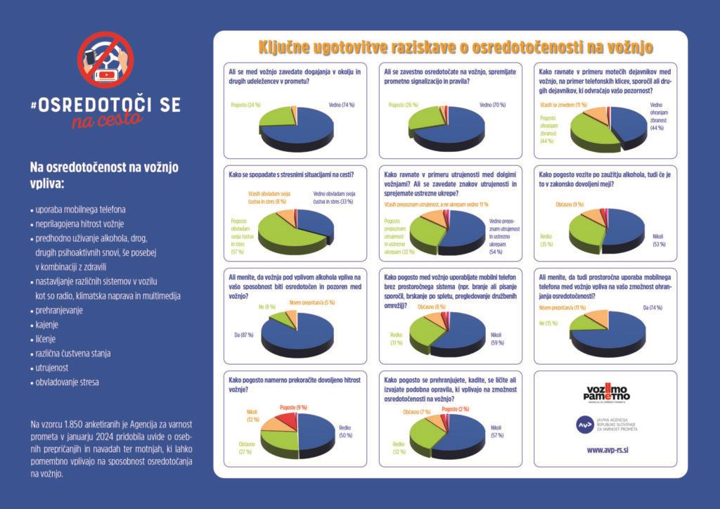 »Da bi pridobili uvide o osebnih prepričanjih in navadah ter motnjah, ki lahko pomembno vplivajo na sposobnost osredotočanja voznikov na vožnjo, je Agencija za varnost prometa januarja letos izvedla tudi spletno anketo, ki jo je izpolnilo 1.850 oseb. Reprezentativen vzorec slovenskih voznic in voznikov je pokazal nekatere zaskrbljujoče rezultate, ki kažejo na to, da je pozornost voznikov na vožnjo prepogosto manjša, kot bi morala biti,« je izpostavila mag. Simona Felser.