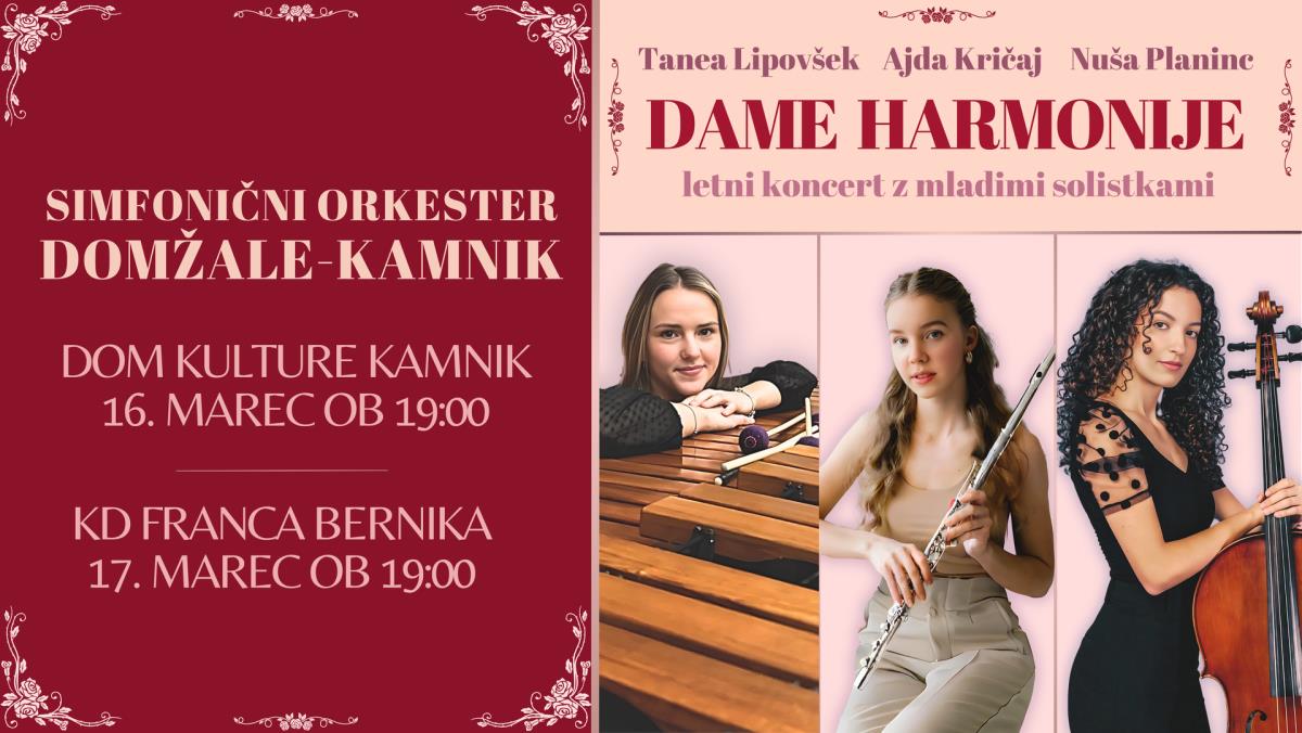 Osrednji del koncerta bodo izvedle dame harmonije - solistke - vsaka s svojim inštrumentom in v svojem slogu. Prva izmed teh, flavtistka Ajda Kričaj, bo očarala s spevnim, umirjenim in na trenutke skoraj meditativnim Concertinom Petra Kopača. Njej sledeča violončelistka Nuša Planinc bo svoje mojstrstvo dokazala v virtuoznih variacijah Une larme (sl. solza) Giachina Rossinija, ki prikazujejo mnoge raznolike plasti in tehnike violončelističnega ustvarjanja, solistični del koncerta pa bo zaključen s tolkalko Taneo Lipovšek, ki bo poslušalce s svojo marimbo popeljala od misteriozne temačnosti 2. do plesne igrivosti 3. stavka Koncerta za marimbo Petra Šavlija.