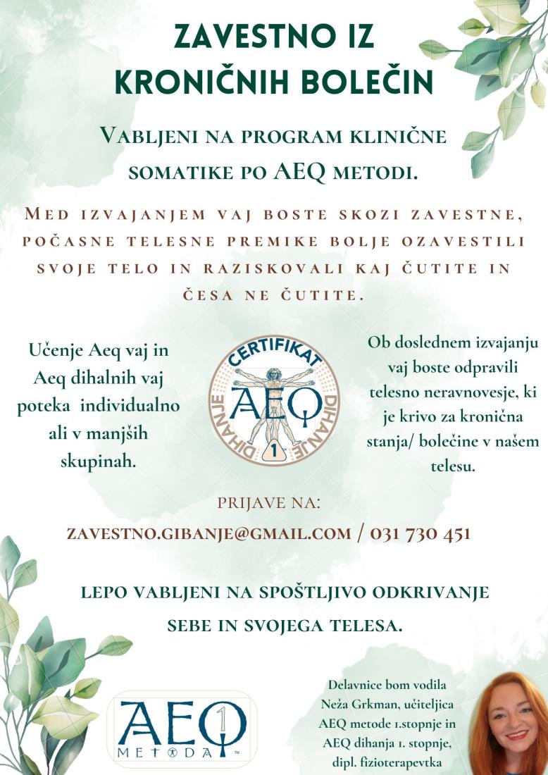 Vabljeni na 4.5-urno delavnico Aeq metode, na kateri bo Neža Grkman, učiteljica AEQ® metode, dihanja in odnosov 1. stopnje, predstavila osnove Aeq pristopa, vas vodila skozi dve Aeq vaji ter dve Aeq dihalni vaji.