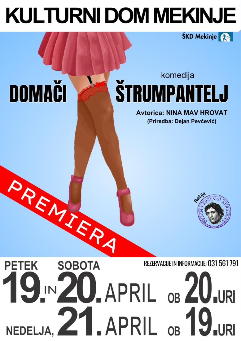 Vabimo vas na PREMIERO komedije DOMAČI ŠTRUMPANTELJ avtorice Nine Mav Hrovat v priredbi in režiji Dejana Pevčevića, ki bo prvič uprizorjena v PETEK, 19. 4. 2024, ob 20:00 v Športno-kulturnem domu Mekinje v izvedbi članov ŠKD Mekinje. Komedija bo imela dve ponovitvi, prvo v SOBOTO, 20. 4. ob 20:00 in drugo v NEDELJO, 21. 4. ob 19:00.