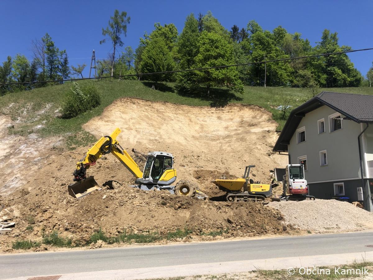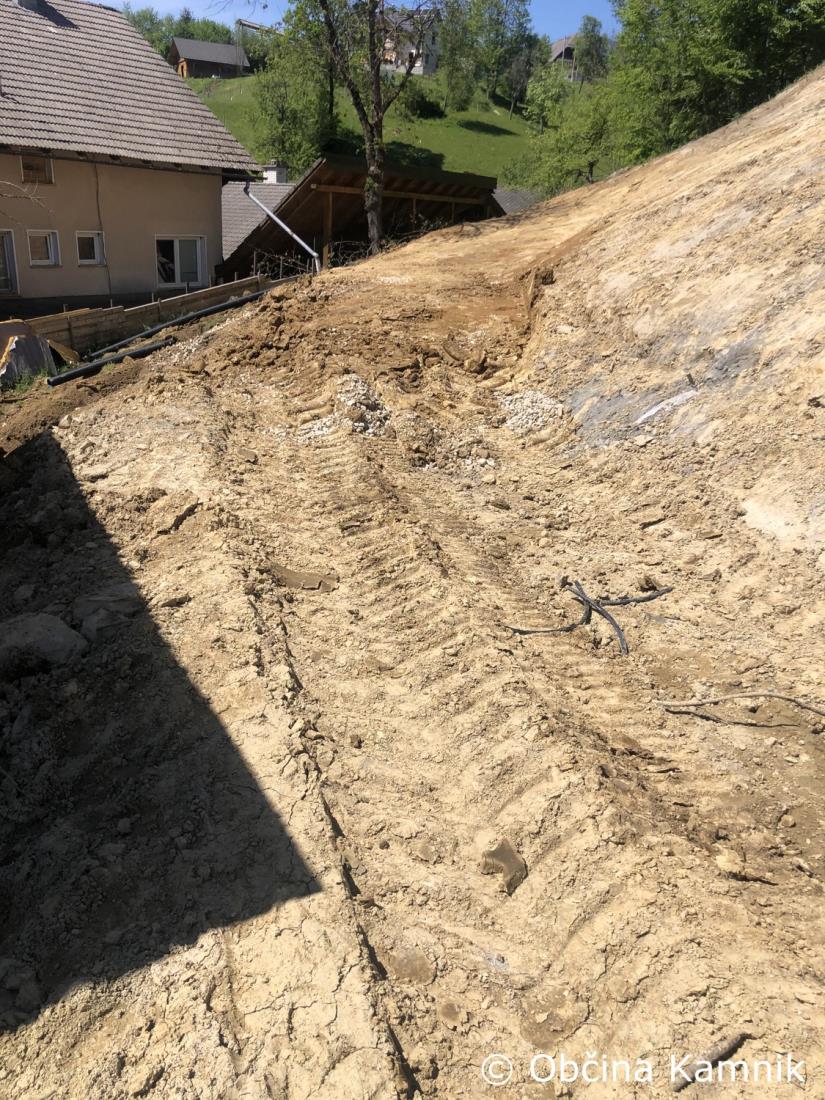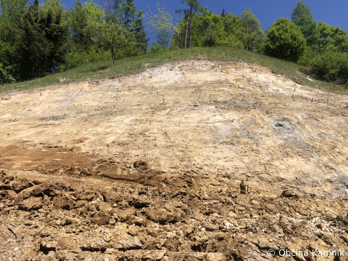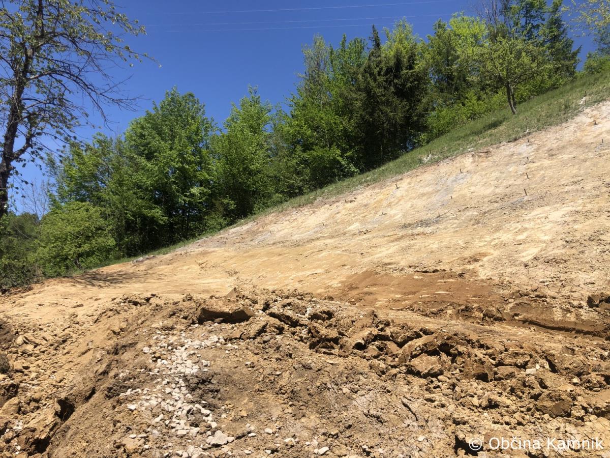 Izvajalec del, Gradbeništvo Prestor d. o. o. d. o. o., izvaja zaključna dela za sanacijo plazu pod cestiščem, JP 661105, na območju Hriba pri Kamniku.