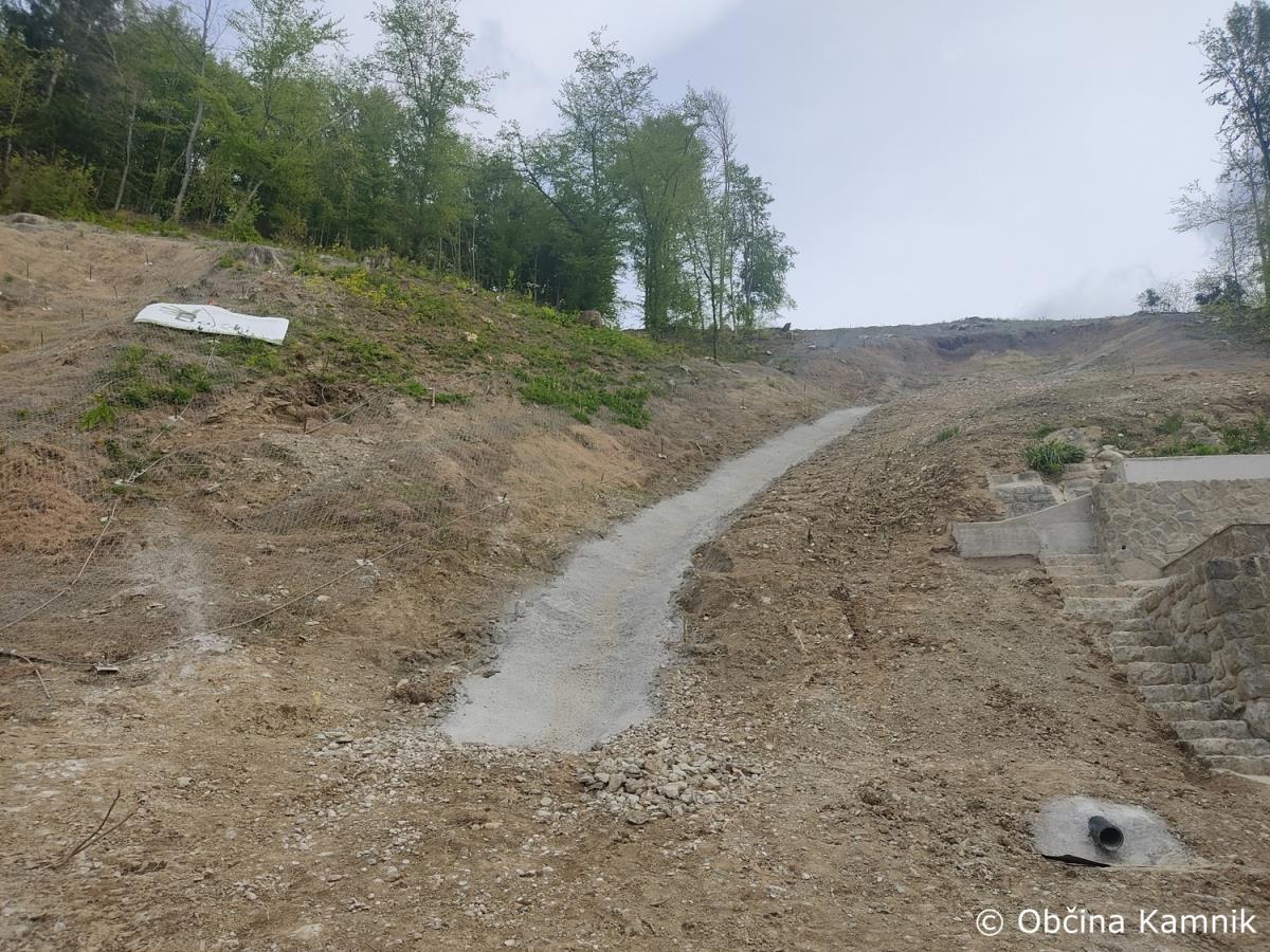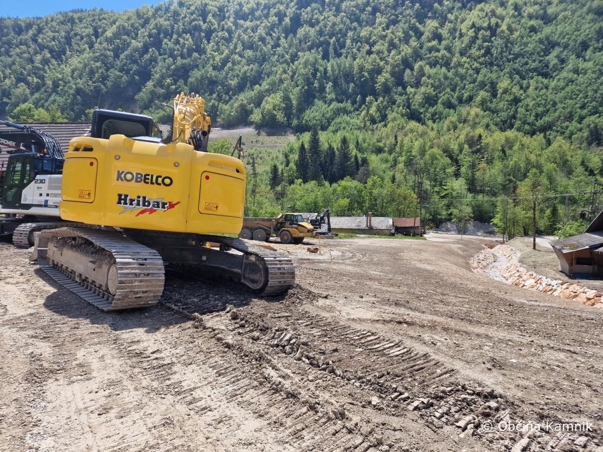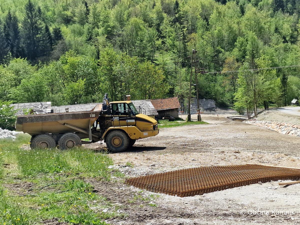 Izvajalec del, Gradbeništvo Prestor d. o. o. d. o. o., izvaja zaključna dela za sanacijo plazu pod cestiščem, JP 661105, na območju Hriba pri Kamniku.