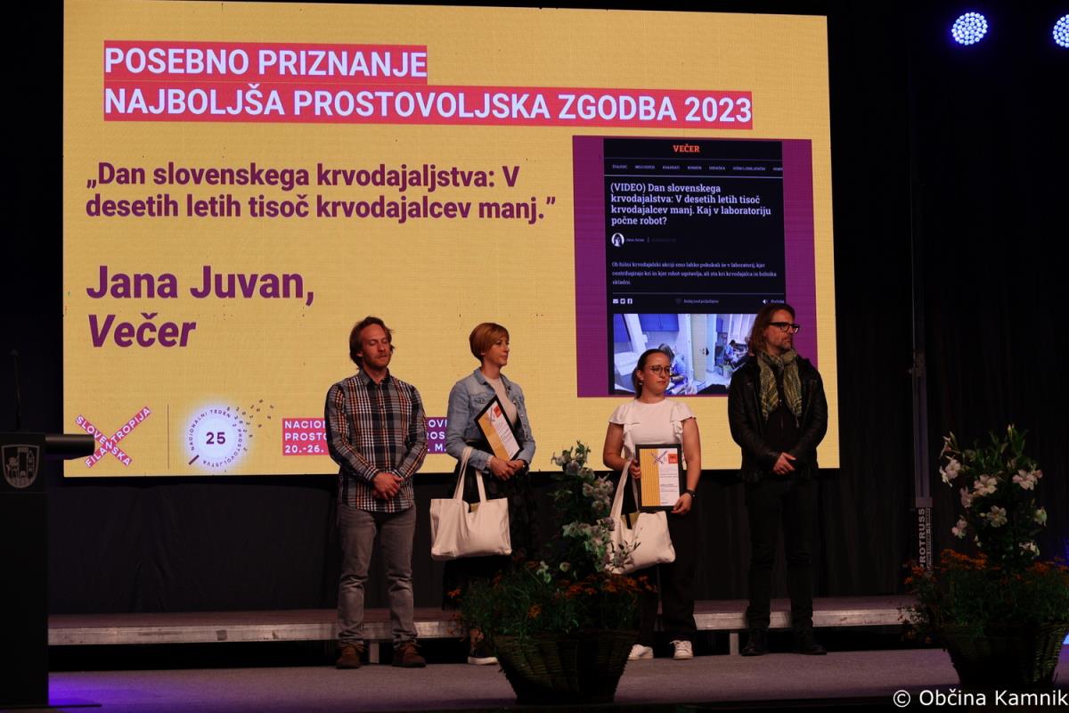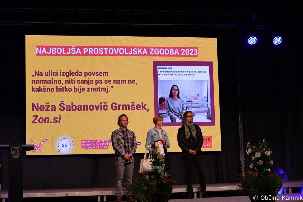 Podžupanja Romana Učakar je ob prejemu naziva poudarila pomen solidarnosti in prostovoljstva, ki smo mu bili priča lani, ko se je Slovenija združila, in se je v luči medsebojne pomoči prizadetim v poplavah pokazalo, da imamo Slovenke in Slovence srce na prvem mestu. Poleg tega pa se je iskreno zahvalila vsem prostovoljskim organizacijam v naši občini, kajti srčnosti, solidarnosti in ljubezni do sočloveka niso samoumevne vrednote. Dejanja, ki jih ustvarjajo prostovoljci občine Kamnik za boljšo prihodnost drugih, tudi ne: »Občina Kamnik podpira delovanje prostovoljstva na več ravneh. V letu 2023 smo skupaj z Občinskim štab civilne zaščite Kamnik, Rdečim Križem Kamnik, organizacijami Župnijske Karitas, društvi, šolami, vrtci, prostovoljci ter vsemi občankami in občani sodelovali pri zbiranju denarnih in materialnih sredstev za odpravljanje posledic avgustovskih poplav. Ravno tako v letu 2023 pa je Občina z Zavodom Zlata mreža in nepogrešljivimi prostovoljnimi šoferji izvajala in zagotavljala sredstva za nemoteno opravljanje brezplačnih prevozov za starejše občane v okviru projekta Prostofer. Občina pa si med drugim prizadeva tudi za projekt Razvoj občinskega modela varstva starejših občanov občine Kamnik ter podpira delovanje Svetovalne pisarne za starejše Kamnik.«