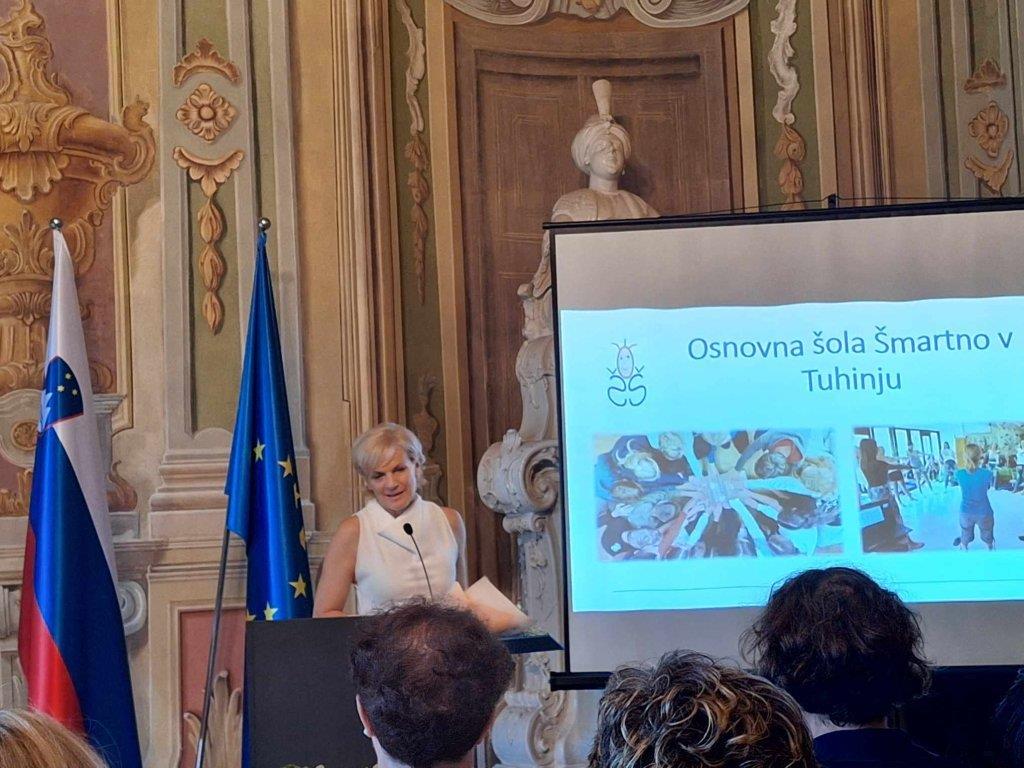 Vodstvo šole z ravnateljico mag. Darjo Krašovec omogoča strokovnim delavcem, da se učijo tudi v drugih okoljih. Osnovna šola Šmartno v Tuhinju že več kot 25 let pušča v matični regiji in tudi širše močan pozitivni pečat na mladih generacijah. Zato Osnovna šola Šmartno v Tuhinju prejme priznanje Blaža Kumerdeja za leto 2023.«