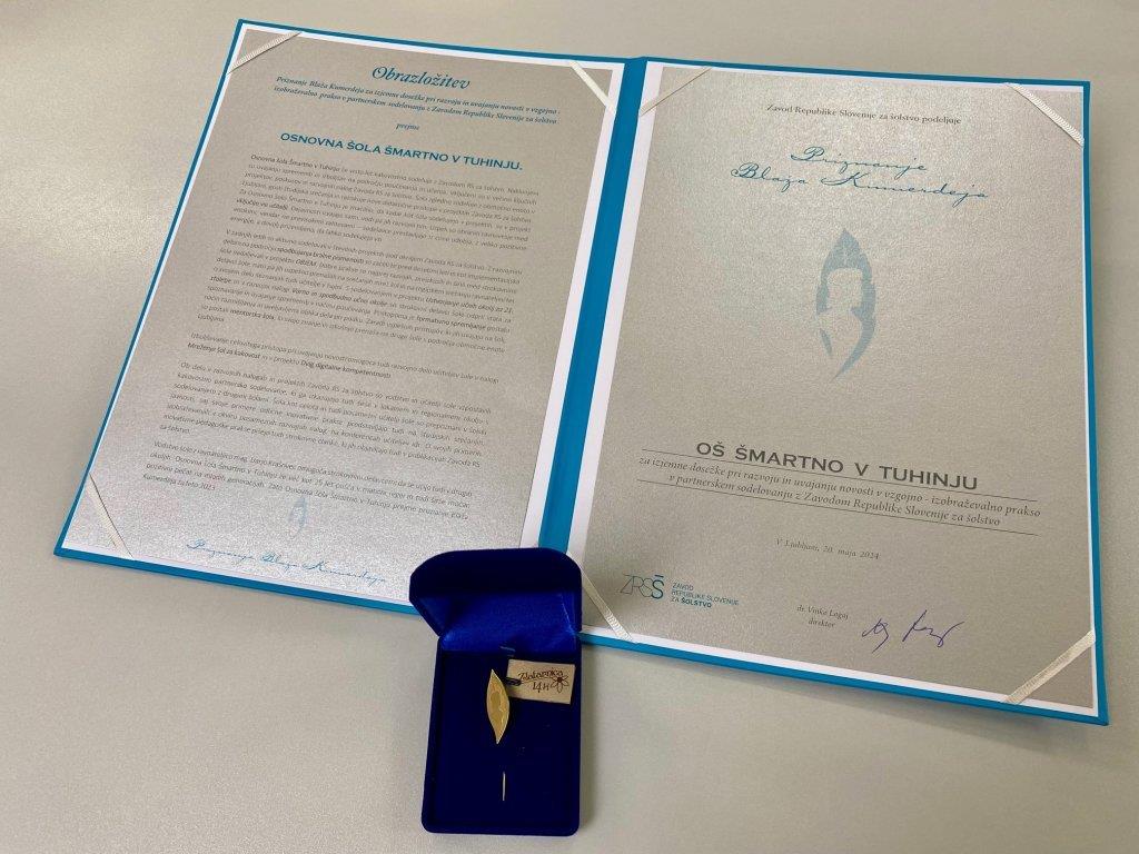 Od leta 1999 Zavod Republike Slovenije za šolstvo podeljuje posameznikom, skupinam ali institucijam priznanja Blaža Kumerdeja za odlično partnerstvo pri razvoju in uvajanju novosti v vzgojno-izobraževalnih ustanovah v sodelovanju z Zavodom Republike Slovenije za šolstvo. Priznanje Blaža Kumerdeja se podeljuje za izjemne dosežke pri razvoju in uvajanju novosti v vzgojno izobraževalno prakso. To prestižno priznanje je dne 20. 5. 2024 za leto 2023 prejela tudi Osnovna šola Šmartno v Tuhinju. Svečana podelitev priznanj je potekala na Cekinovem gradu v Ljubljani.