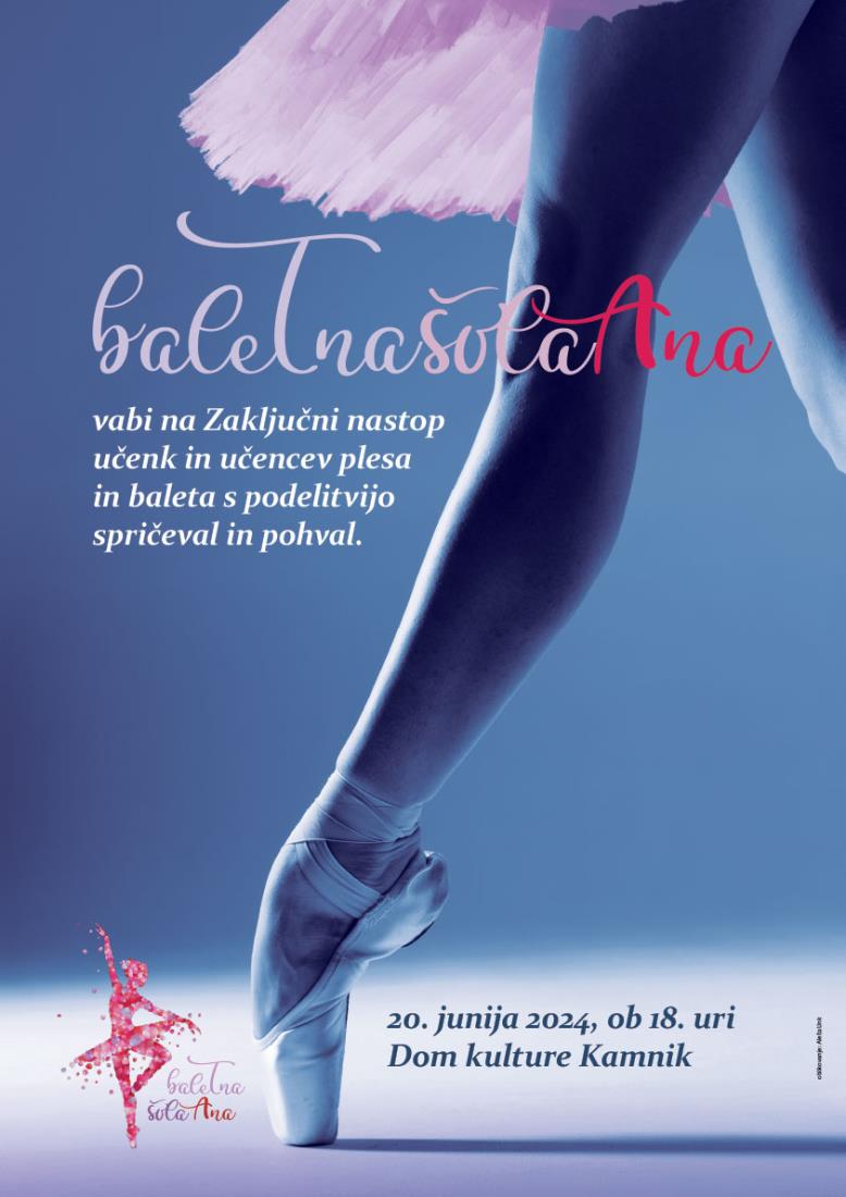 Na letošnjem Zaključnem nastopu bodo zaplesali vsi oddelki Baletne šole Ana, od najmlajše skupine 4-5 letnih otrok, ki obiskujejo plesni vrtec 1, predšolske skupine plesni vrtec 2, baletnih pripravnic iz Kamnika in Radomelj, kjer tudi poteka izobraževanje, pa do učenk 5. razreda baleta, ki že plešejo v trdih baletnih copatki na konicah prstov, imenovanih špice.