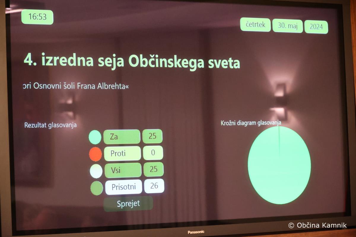 Danes je v Sejni dvorani Občine Kamnik potekala 4. izredna seja Občinskega sveta Občine Kamnik. Svetnice in svetniki so med drugim sprejeli Sklep o lokacijski preveritvi za enoto urejanja prostora KA-42 v mestu Kamnik v Občini Kamnik (identifikacijska št. pa: 3656), potrdili Investicijski program (IP) »zunanje športne površine pri Osnovni šoli Frana Albrehta«, potrdili so Dokument identifikacije investicijskega projekta (DIIP) »nova športna dvorana pri Osnovni šoli Frana Albrehta«, Investicijski program (IP) »nova športna dvorana pri Osnovni šoli Frana Albrehta« in sprejeli Predinvesticijske zasnove (PIZ) »nova športna dvorana pri Osnovni šoli Frana Albrehta«. Po skrajšanem postopku je bil sprejet še Odlok o rebalansu proračuna Občine Kamnik za leto 2024.