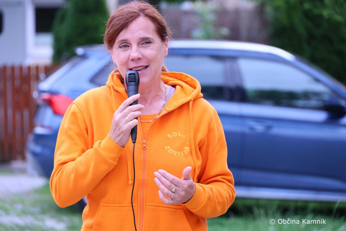 Podžupanja Romana Učakar je pozdravila vse kamniške članice in člane Društva Šola zdravja in goste ter dejala: »Lepo vas pozdravljam v imenu župana in vam čestitam za to, da že 15 let vztrajate pri telovadbi in krepite svoje telo ter s tem negujete tudi svoj um. Verjamem, da ni lahko vstati vsako jutro, a verjamem tudi, da ko oddelate vaje in se podružite, se dan lepše ne bi mogel začeti. Nadaljujte s tem poslanstvom še naprej. Ste velik zgled, tudi mlajšim generacijam. Hvala vsem, ki ste tu, saj ste ambasadorji zdravja in dobrega počutja. Želim vam lepo praznovanje obletnice in da bi še naprej vsak dan srečevala vesele ljudi s prepoznavnimi oranžnimi majčkami.«
